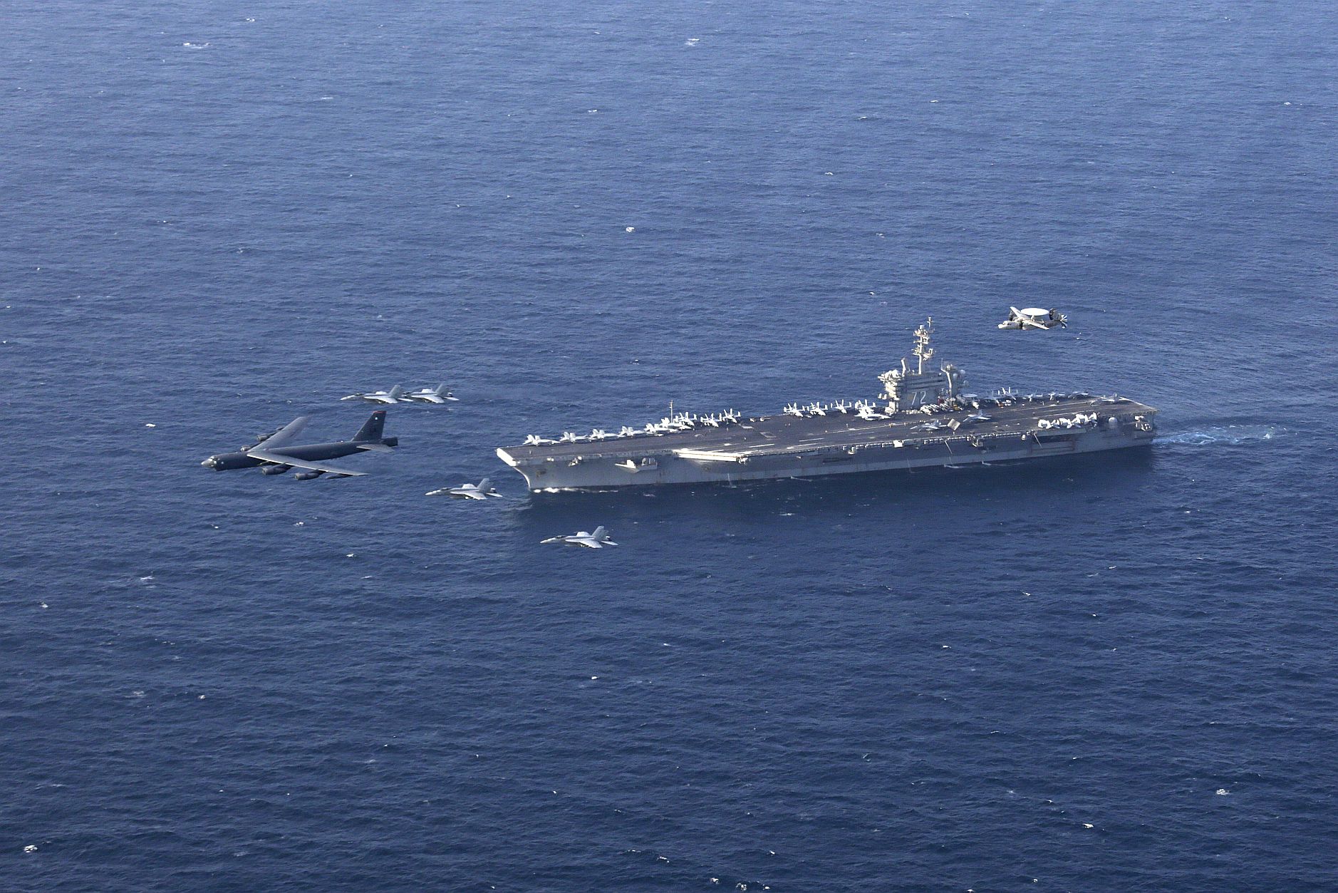 196k | The Abraham Lincoln Carrier Strike Group and a U.S. Air Force B-52H Stratofortress, assigned to the 20th Expeditionary Bomb Squadron and part of the Bomber Task Force deployed to the region, conduct joint exercises in the Arabian Sea, in the U.S. Central Command area of responsibility, 1 June 2019. The demonstration of flexible and adaptable joint operations shows U.S. military forces are prepared to respond to contingencies and defend American interests in the region. With Abraham Lincoln as the flagship, deployed strike group assets include staffs, ships and aircraft of Carrier Strike Group (CSG) 12, Destroyer Squadron (DESRON) 2, the guided-missile cruiser USS Leyte Gulf (CG-55) and Carrier Air Wing (CVW) 7. NS0272ao: U.S. Navy photo by Mass Communication Specialist 1st Class Brian M. Wilbur (# 190601-N-FK070-1404). NS0272aoa: U.S. Navy photo by Mass Communication Specialist 1st Class Brian M. Wilbur (# 190601-N-FK070-1595). |