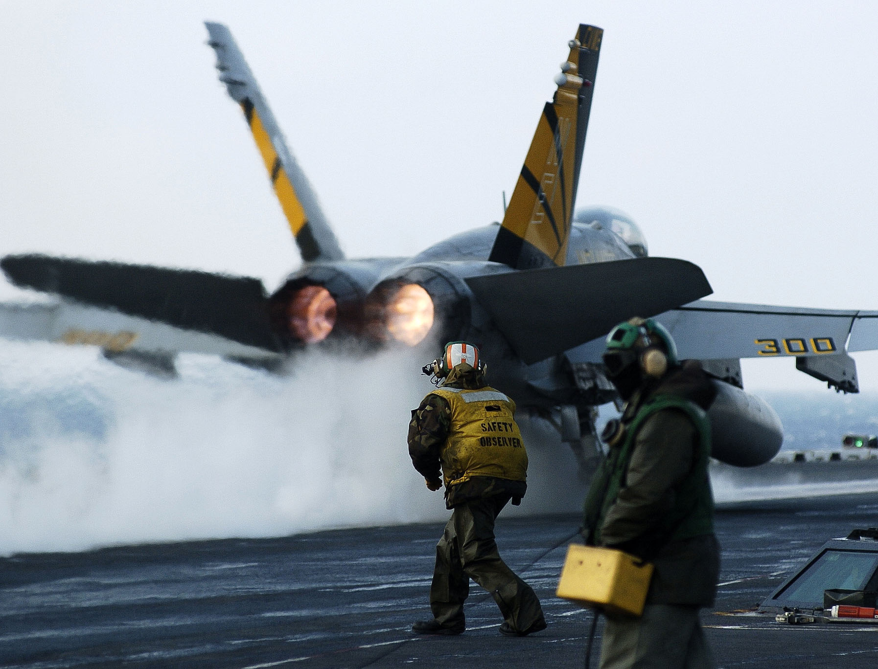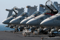 83k | The Arabian Gulf, Mar. 26, 2003 An F/A-18E Super Hornet assigned to the "Fist of the Fleet" of Strike Fighter Squadron Twenty Five (VFA-25) prepares to launch from the aircraft carrier, deployed in support of Operation Iraqi Freedom. U.S. Navy photo by Photographer's Mate 3rd Class Michael S. Kelly. [030326-N-9228K-001]. |