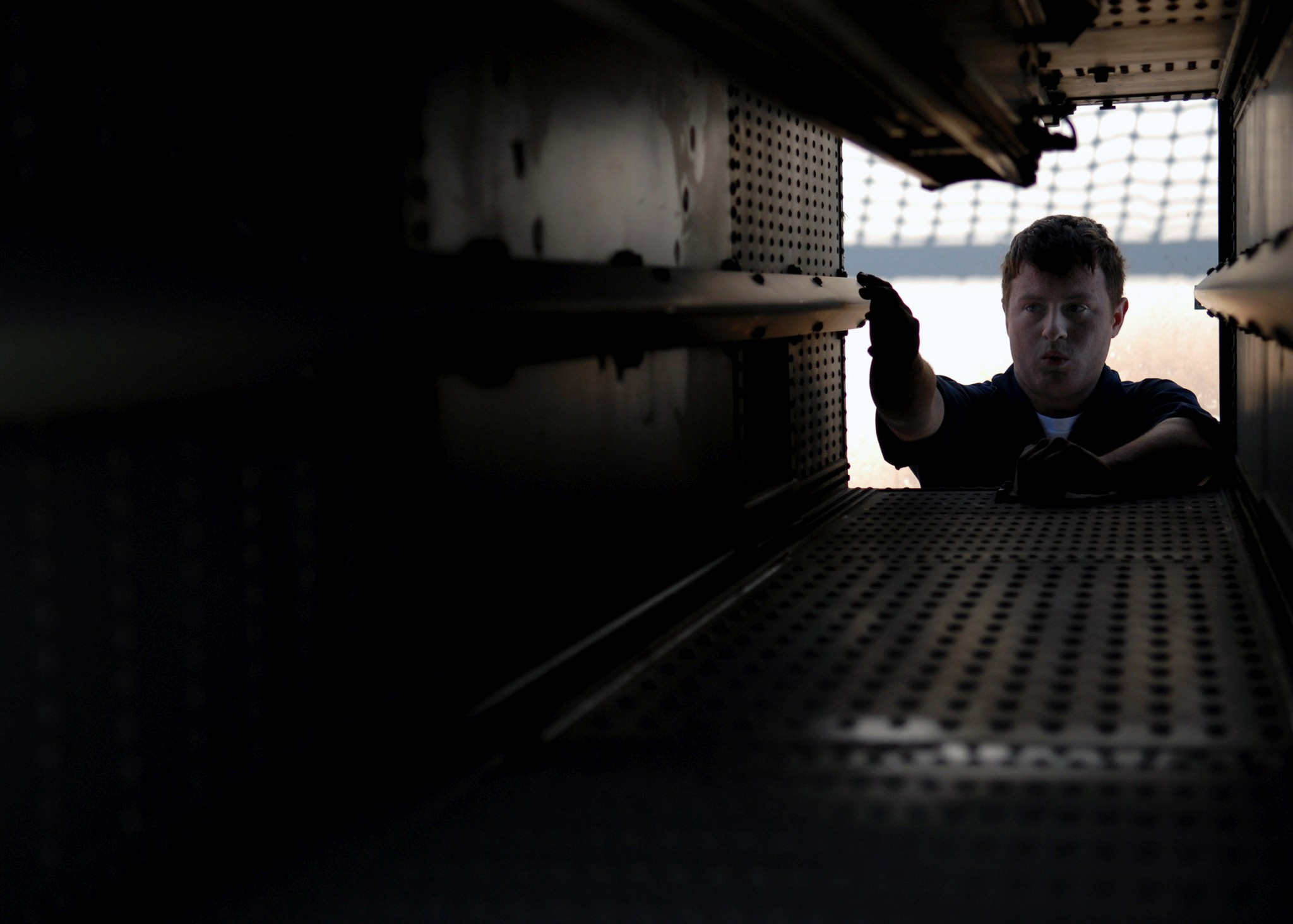 332k | Sailors assigned to the "Stingers" of Strike Fighter Squadron (VFA) 113 perform a pre-flight inspection on an F/A-18C(N) Hornet aboard USS Abraham Lincoln (CVN-72) in the Gulf of Alaska, 21 April 2002. U.S. Navy photo by Photographer's Mate Airman Mason Cavazos (# 020421-N-0268C-001). |