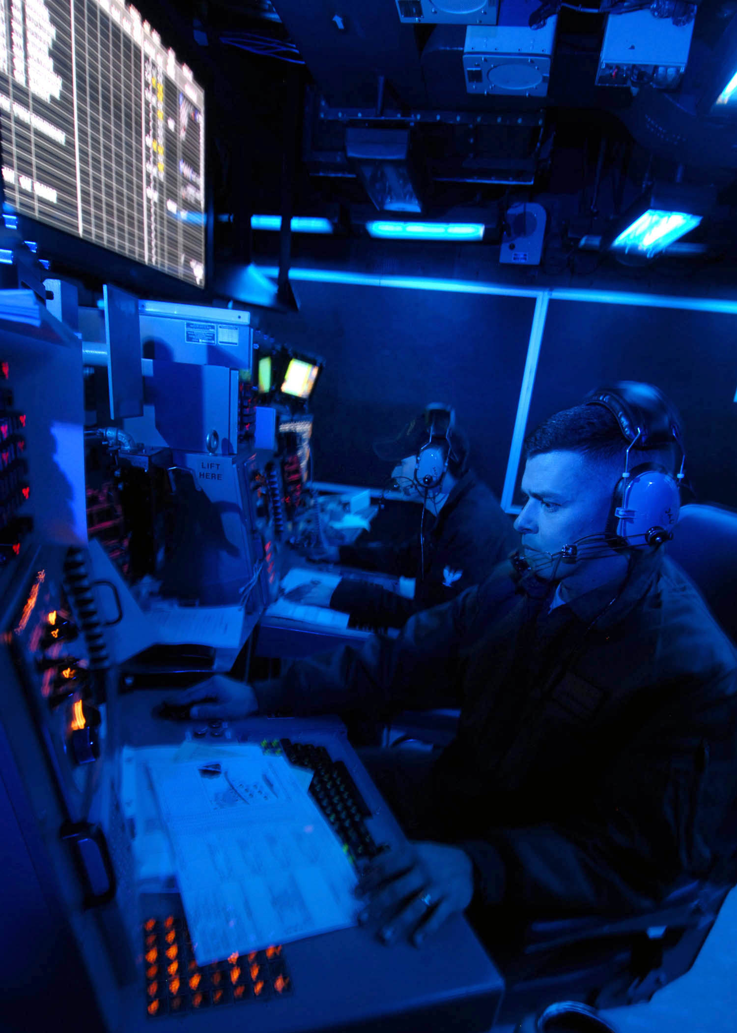 1.51M | The Tactical Operations Officer (TAO), along with Operations Specialists, stand watch in the Combat Direction Center (CDC) aboard USS Abraham Lincoln (CVN-72), monitoring all surface and aerial contacts in the operating area, 23 March 2003, in the Persian Gulf. The Nimitz-class aircraft carrier and embarked Carrier Air Wing (CVW) 14 were deployed conducting combat missions in support of Operation Iraqi Freedom. US Navy photo by Photographer's Mate Airman Tiffany A. Aiken (# 030323-N-5796A-002). |