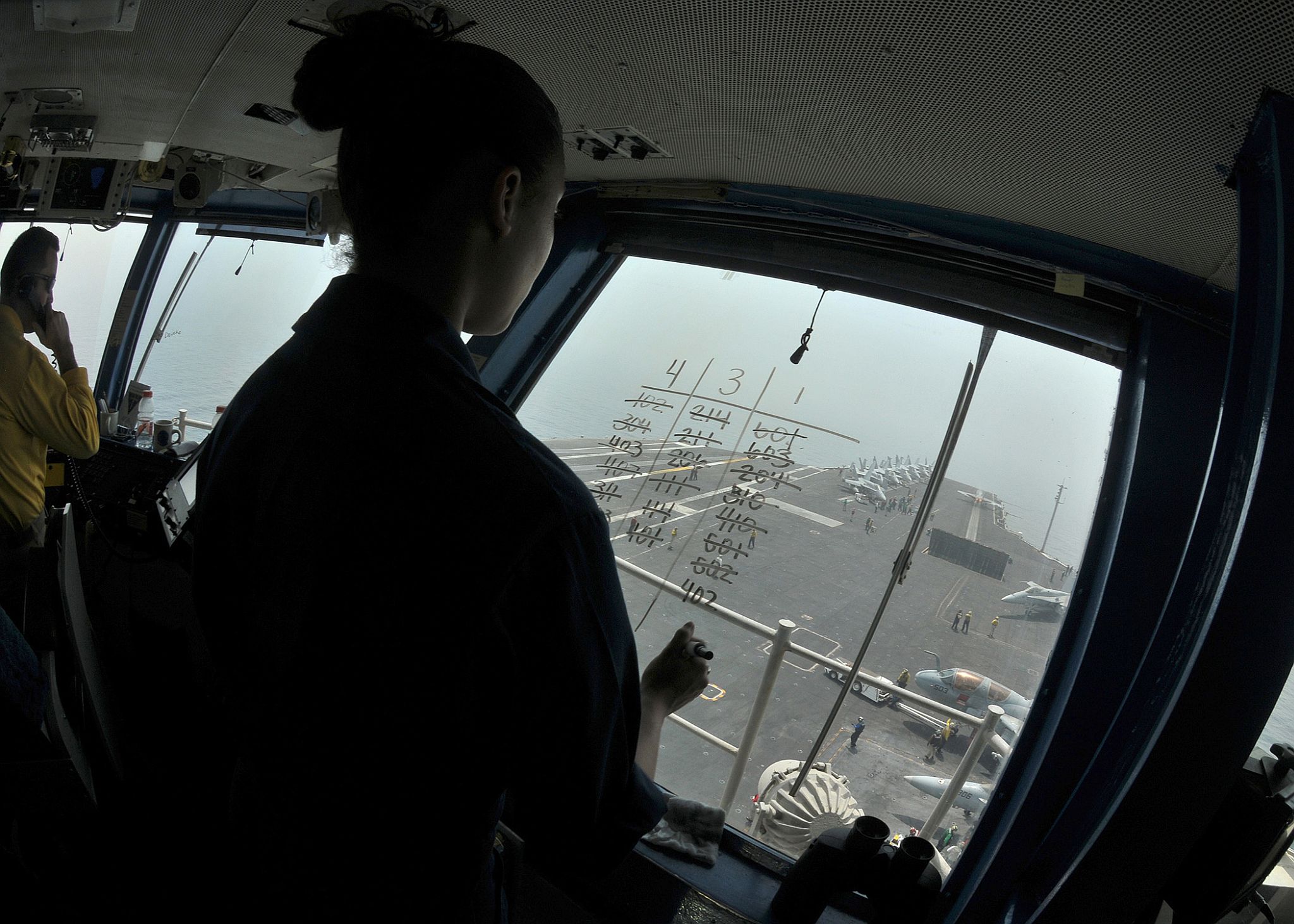 381k | Aviation Boatswain's Mate (Handling) Airman Shayla Thomas marks off the side numbers of successfully launched aircraft aboard USS Abraham Lincoln (CVN-72), 2 June 2008, in the Persian Gulf. The Nimitz-class aircraft carrier was deployed to the U.S. 5th Fleet area of responsibility supporting maritime security operations. U.S Navy (USN) photo by Mass Communication Specialist 3rd Class Brandon C. Wilson (# 080602-N-1745W-187). |
