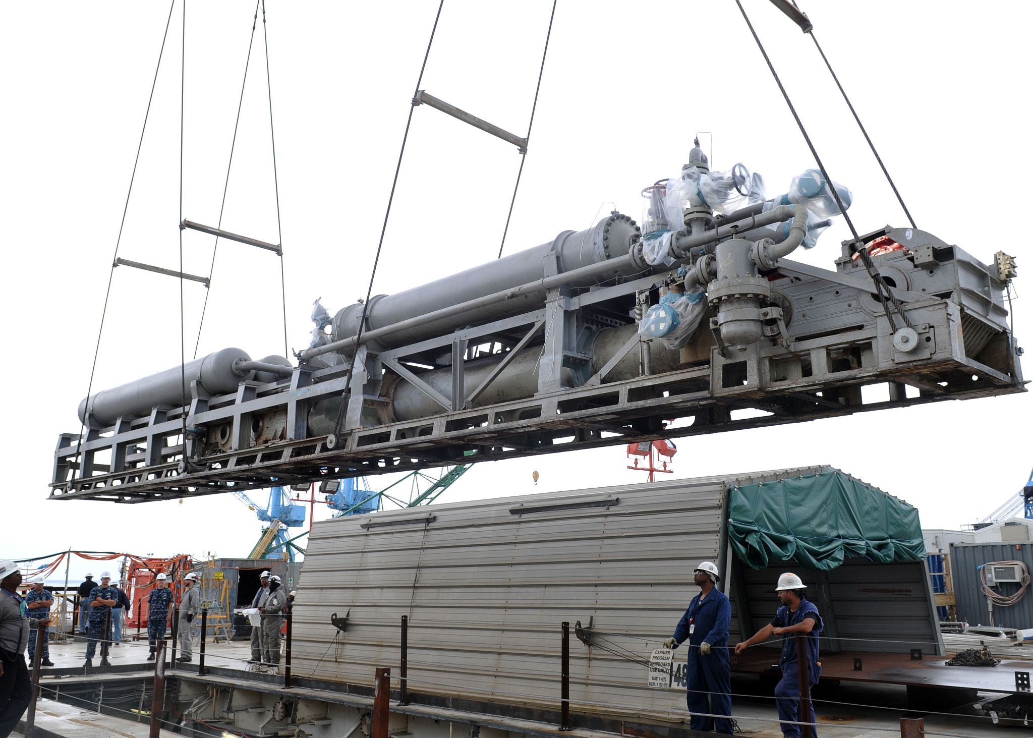 386k | The arresting gear engine for the #2 wire of USS Abraham Lincoln (CVN-72) is raised from the flight deck to be removed from the ship for repairs, 3 June 2013. The Nimitz-class aircraft carrier was undergoing a refueling and complex overhaul (RCOH) in Newport News, Va. U.S. Navy photo by Mass Communication Specialist Seaman Michael S. Raney, # 130603-N-MC421-021. |
