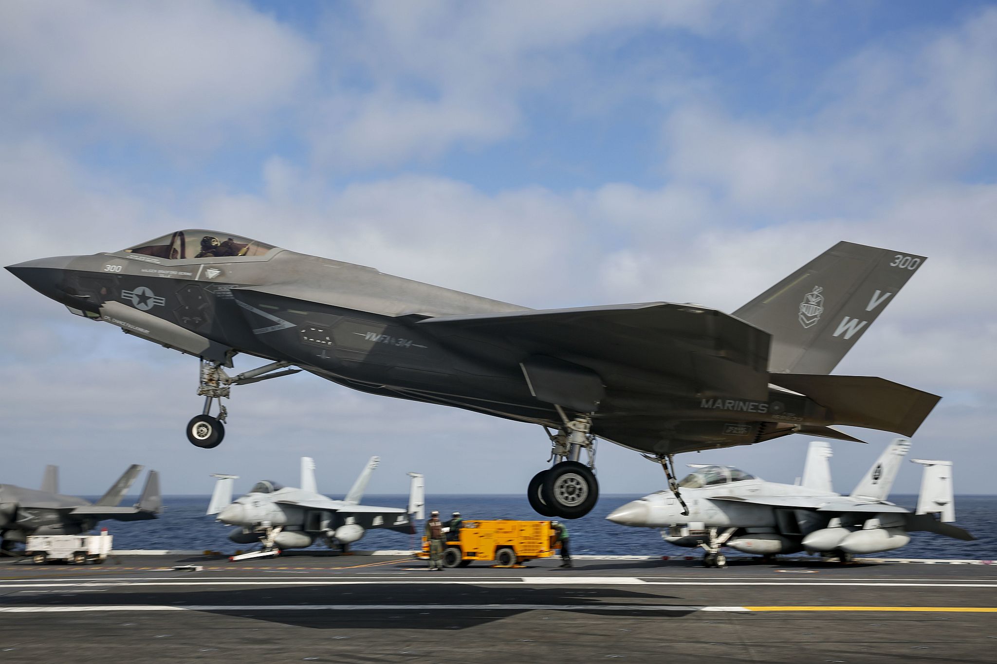 224k | An F-35C Lightning II (BuNo 169633, modex VW-300), assigned to the "Black Knights" of Marine Fighter Attack Squadron (VMFA) 314, prepares to land on the flight deck of USS Abraham Lincoln (CVN-72), 24 November 2021, in the Pacific Ocean. The Nimitz-class aircraft carrier was underway conducting routine operations in the U.S. 3rd Fleet. U.S. Navy photo by Mass Communication Specialist 3rd Class Michael Singley (# 211124-N-MM912-1067). |