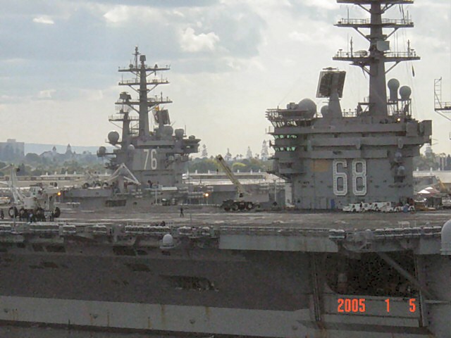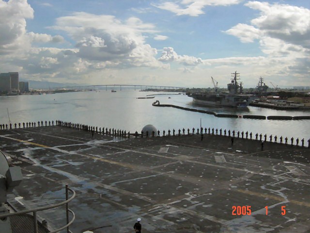 ![]() 5 January 2005 Departing San Diego, USS Nimitz (CVN-68) and USS Ronald Reagan (CVN-76), in the distance, seen from USS John C. Stennis (CVN-74) (128Kb) |