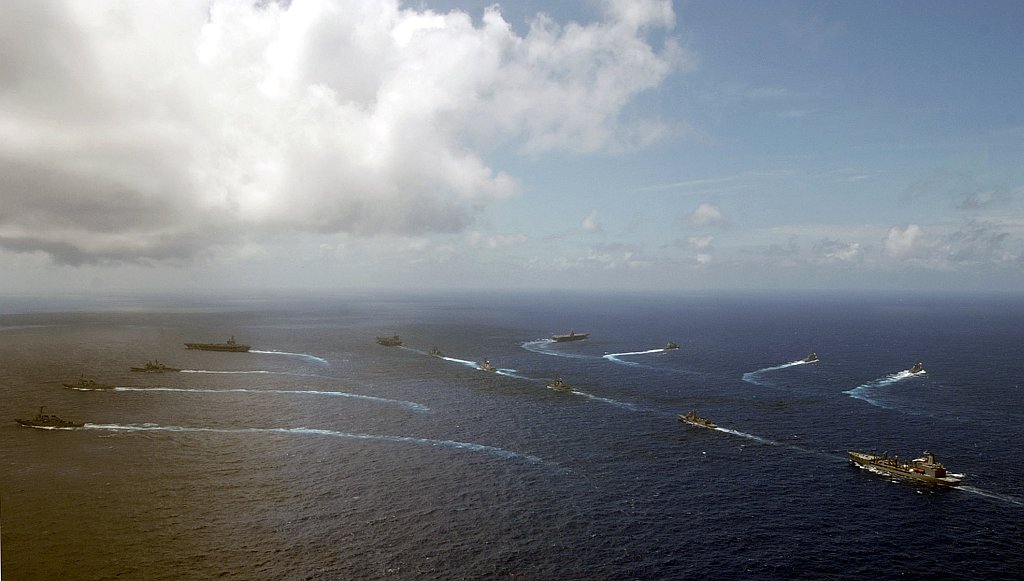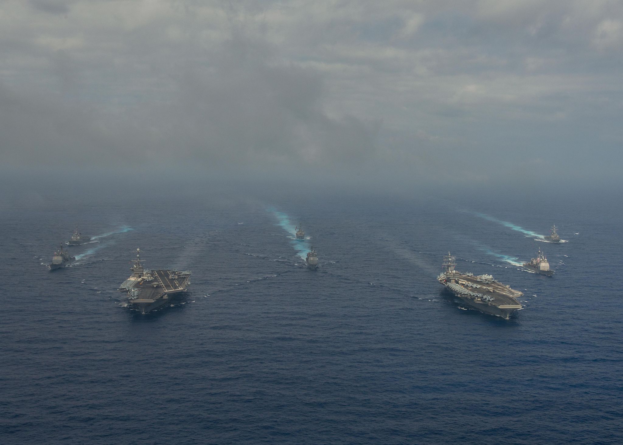 530k | U.S. Navy ships assigned to Carrier Strike Group (CSG) 5 sail in formation during a live-fire gunnery exercise, 29 June 2017, in the Pacific Ocean—USS Ronald Reagan (CVN-76), followed by Ticonderoga-class guided-missile cruiser USS Shiloh (CG-67) and three Arleigh Burke-class guided missile destroyers. Ronald Reagan was the flagship of the CSG, providing a combat-ready force that protected and defended the collective maritime interests of U.S. allies and partners in the Indo-Asia-Pacific region. U.S. Navy photo by Mass Communication Specialist 2nd Class Nathan Burke (# 170629-N-OI810-1112). |