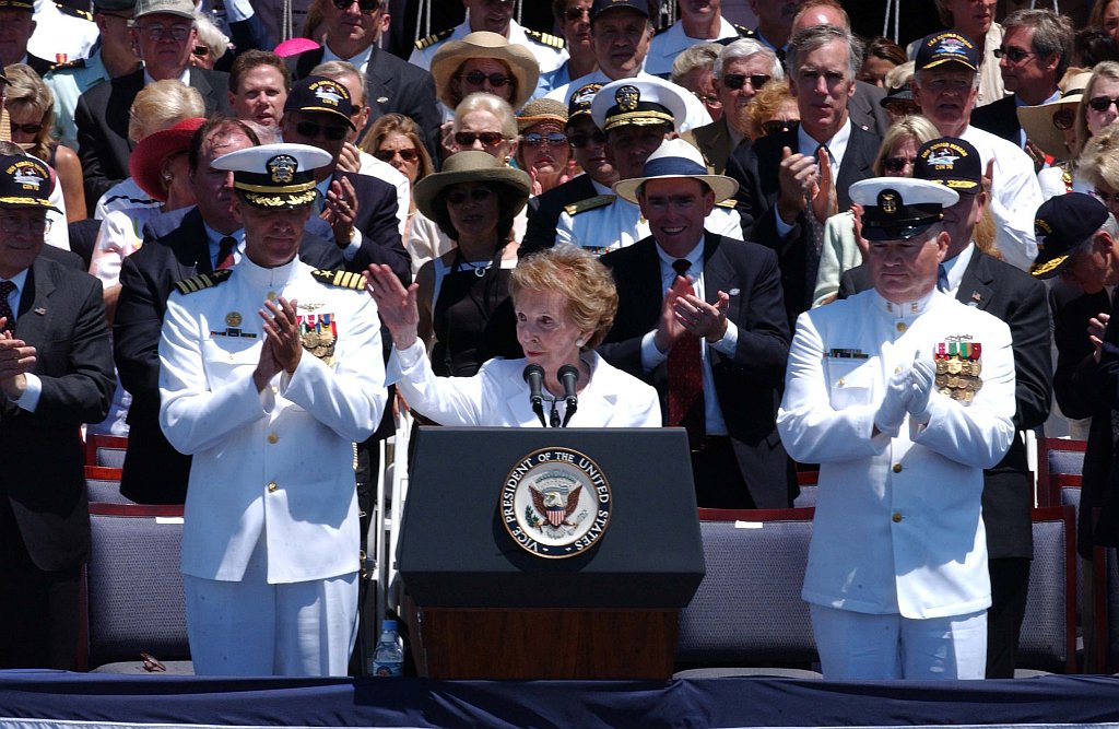 90k | Vice President Dick Cheney, the principal speaker at the commissioning ceremony of the ninth Nimitz-class nuclear powered aircraft carrier, USS Ronald Reagan (CVN-76), addresses a distinguished audience. In the front row, behind Mr. Cheney, are the ship's sponsor and former First Lady, Mrs. Nancy Reagan; the ship's first Commanding Officer, Captain Bill Goodwin; and Acting Secretary of the Navy, Honorable Hansford T. Johnson. U.S. Navy photo by Photographer’s Mate 3rd Class Rusty Black (# 030712-N-4616B-003). |