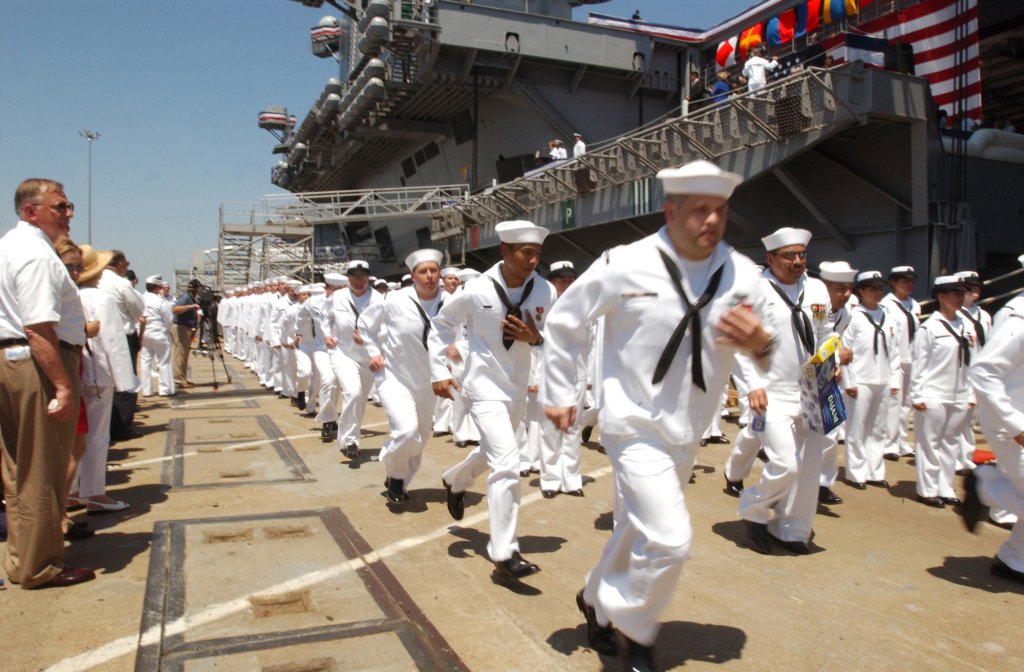 119k | Crewmembers of the aircraft carrier USS Ronald Reagan (CVN-76) keep with the Navy tradition of running up the gangplanks to bring the ship to life during the ship's commissioning ceremony aboard Naval Station Norfolk, Va. U.S. Navy photo by Photographer’s Mate 3rd Class Rusty Black (# 030712-N-4616B-005). |