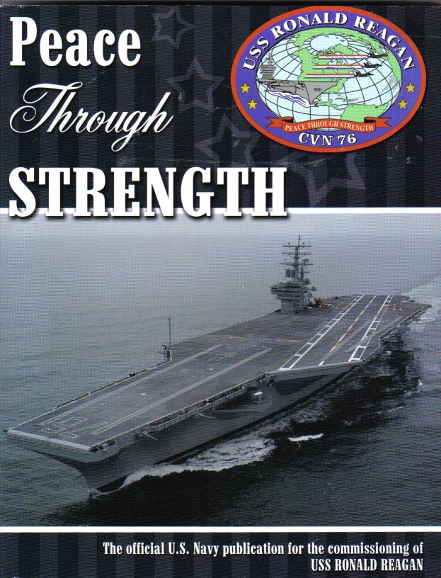 60k | U.S. Navy fighter aircraft perform a flyover at the conclusion of the commissioning ceremony of the aircraft carrier USS Ronald Reagan (CVN-76). The ship’s motto is “Peace Through Strength” a phrase coined by President Reagan who is widely credited for bringing an end to the Cold War, and rebuilding the U.S. military. U.S. Navy photo by Photographer’s Mate 3rd Class Rusty Black (# 030712-N-4616B-004). |