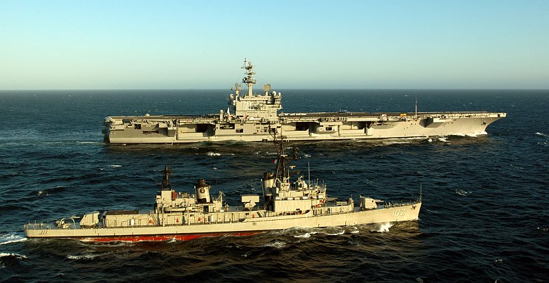 As built: Displacement: 77,600+ tons (98,235+ fl) Dimensions: 1,040' wl (1,092' oa) x 134' (252' fd) x 37' / 317 wl (332.8 oa) x 40.8 (76.8 fd) x 11.3 meters Armor: unknown Power plant: 2 A4W nuclear reactors, 4 steam turbines, 4 screws; 260,000+ shp (*) Speed: 30+ knots Endurance: 1.5 million nm @ 20 knots (*) Armament: Two Mk.29 8-cell NATO Sea Sparrow launchers; two 21-cell RAM launchers Radar: SPS-48E 3D air search; SPS-49A(V)1 2D air search; SPS-67(V) surface search; Mk.23 target acquisition; SPN-43B and 2 SPN-46 air traffic control; SPN-44A landing aid Fire control: 3 Mk.91 NSSM systems with Mk.95 radars EW: SLQ-32(V)4 active jamming/deception; WLR-1H ESM; Mk.36 SRBOC decoy; SLQ-25A Nixie decoy Aircraft: 80+ Aviation facilities: 4 elevators; 4 steam catapults Crew: 5,700-5,900