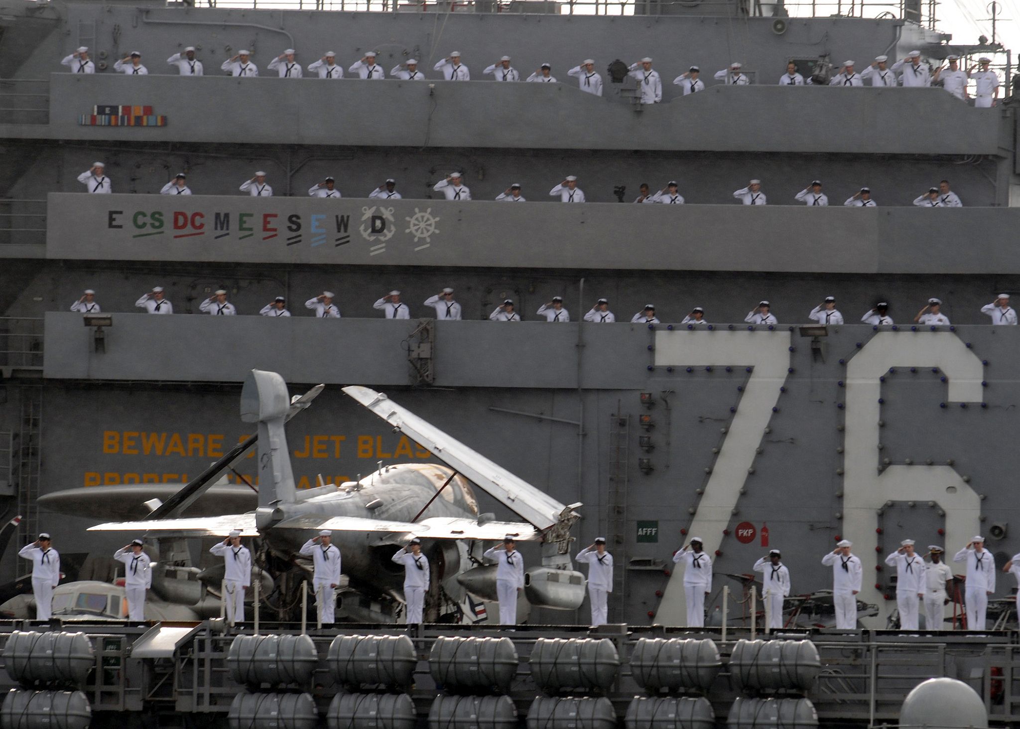 120k | Sailors stationed aboard the Navy's newest aircraft carrier, USS Ronald Reagan (CVN-76) "man the rails" during the commissioning ceremony. U.S. Navy photo by Photographer's Mate 3rd Class Kittipogse Amaritnant (# 030712-N-8148A-503). |