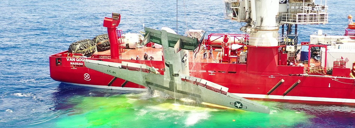 561k | A C-2A(R) Greyhound assigned to the "Providers" of Fleet Logistics Support Squadron (VRC) 30 Det. 5 (BuNo 162175, NF33) lands on the flight deck of USS Ronald Reagan (CVN-76), 3 July 2017, in the Pacific Ocean. The Greyhound held the cremains of Julius H. Frey and wife, Jerry A. Frey, which were scheduled for a burial-at-sea aboard the Nimitz-class aircraft carrier, 15 July. Julius was a World War II veteran who fought in the Battle of Coral Sea aboard the aircraft carrier USS Lexington (CV-2). Ronald Reagan was the flagship of Carrier Strike Group 5, which was on patrol in the U.S. 7th Fleet area of operations in support of security and stability in the Indo-Asia-Pacific region. U.S. Navy photo by Mass Communication Specialist 2nd Class Kenneth Abbate (# 170703-N-OY799-082). — On 22 November 2017 BuNo 162175, carrying 11 crew and passengers, crashed some 500 nm southeast of Japan's Okinawa Island in the Philippine Sea, while in flight to Ronald Reagan. Eight of the 11 were rescued. The aircraft was located on the ocean floor at a depth of 18,500 ft (5,639 m) during the last week of December 2017, when a salvage ship used a pinger receiver to locate the aircraft's emergency signal. U.S. Navy's Supervisor of Salvage and Diving team, working from the contracted diving support and construction vessel Van Gogh, recovered the fuselage using the deep ocean remotely operated vehicle CURV 21, 20 May 2019. The aircraft was recovered at the request of Commander Pacific Fleet in order to facilitate the mishap investigation. U.S. Navy photo by SUPSALV, # 190520-N-LC447-263. |