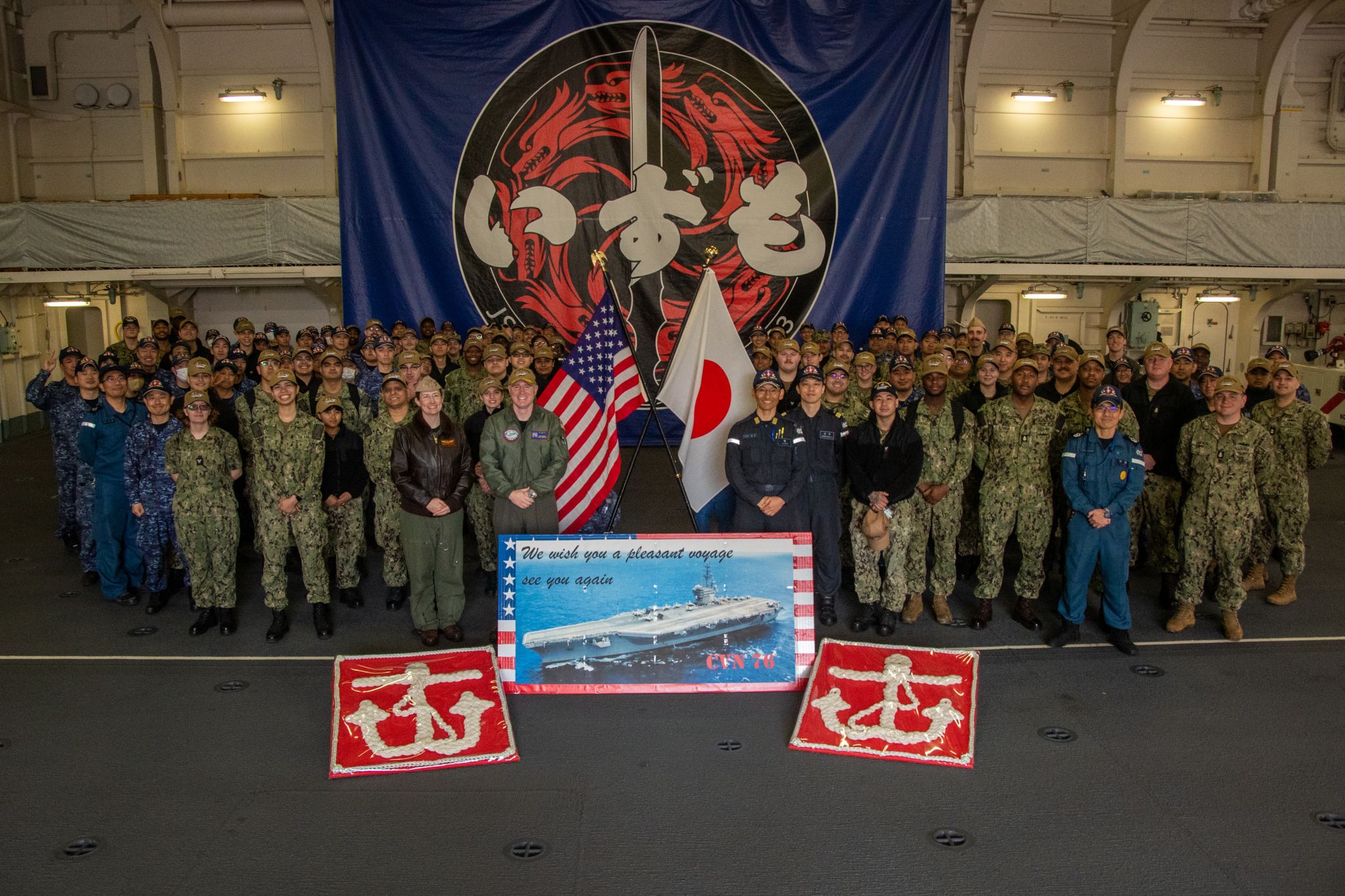 513k | Sailors assigned to the U.S. Navy's only forward-deployed aircraft carrier, USS Ronald Reagan (CVN-76), and sailors of the Japan Maritime Self-Defense Force (JMSDF), pose in the hangar bay of JMSDF helicopter destroyer, JS Izumo (DDH-183), in Yokosuka, Japan, 2 April 2024. U.S. Navy Photo by Mass Communication Specialist 3rd Class Kaleb Birch (# 240402-N-EC000-1029). (Izumo was subsequently reclassified as an aircraft-carrying multi-role cruiser, CVM-183.) |