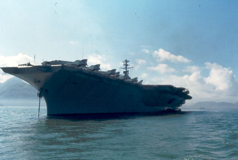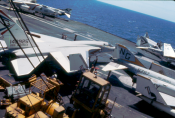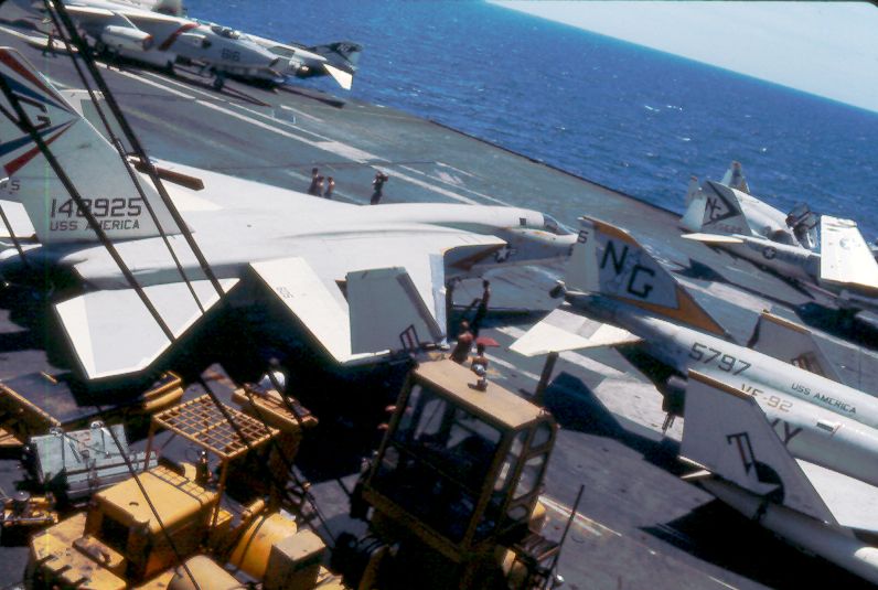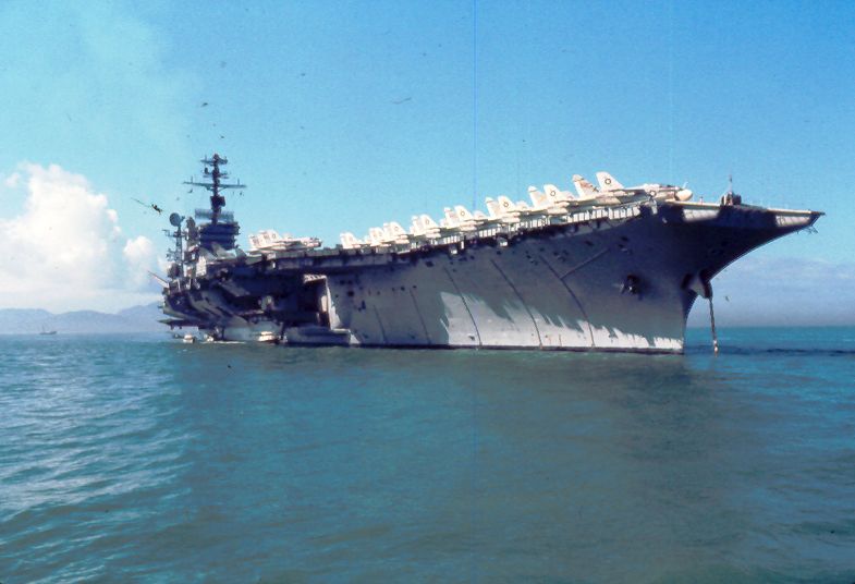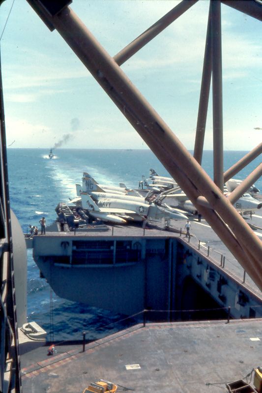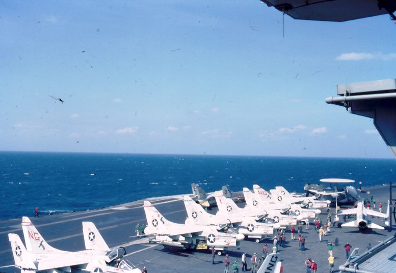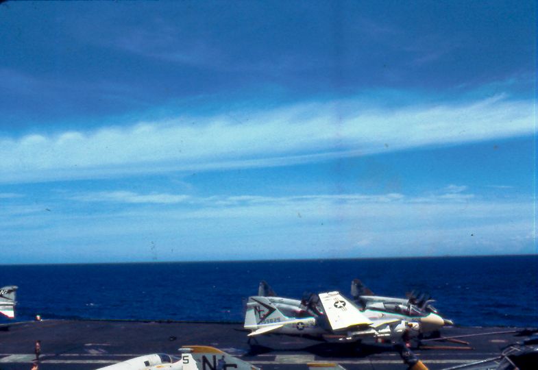![]() A-7E Corsair IIs. Note F-4J Phantom II launching from one of the waist catapults. NS-cv66-lmrh51 |