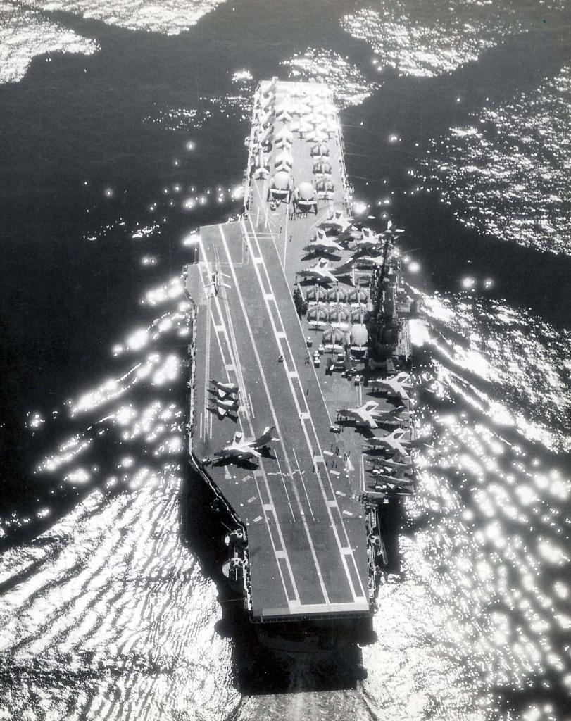 179k | This is undoubtedly a Forrestal-class carrier (elevator arrangement), and the time frame should be 1961–63 (aircraft mix, no guns forward). Ranger can be discarded outright, as she retained her forward sponsons throughout her career. Hull number cannot be seen, but it appears there's a hint of a "6" forward—this, along with the fact that F3H Demons were not part of any Carrier Air Group/Wing regularly attached to Forrestal after 1958, probably discards Forrestal herself. That leaves Saratoga and Independence, probably Sara, as she appears to have an open stern. (Larger image available on request.) Charles Teschke comments: "The Indy had JBD (Jet Blast Deflectors) in the deck behind all the cats, unless they were added at a later date. I was aboard the Indy from 72–74 in VA-65." Jim Azelton adds: "I am certain the carrier in this photo is Saratoga. I was onboard Indy from '92 to '97 and there are some distinguishing features of the flight deck which sets Indy apart. From what I have seen of the Forrestal-class boats, there are, apparently, two 'sub-types': Forrestal/Saratoga and then Ranger/Independence."