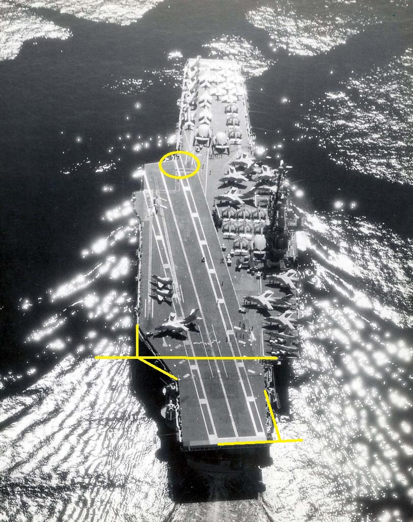 "I have marked-up a copy of the picture to pin-point the areas I mention here." Ronny Svendsen notes: "The photo in question is of USS Saratoga Med Cruise 1963." "The extension of the flight deck behind the port forward elevator first appeared in the 1963 cruise book. This was also the last cruise with the F3H-2 (F-3B), as the next CVA-60 cruise had the F-4B. Tailcode of the CVW is AC!" "It is not CVA-62 due to different layout of the aft starboard corner of the flight deck." |