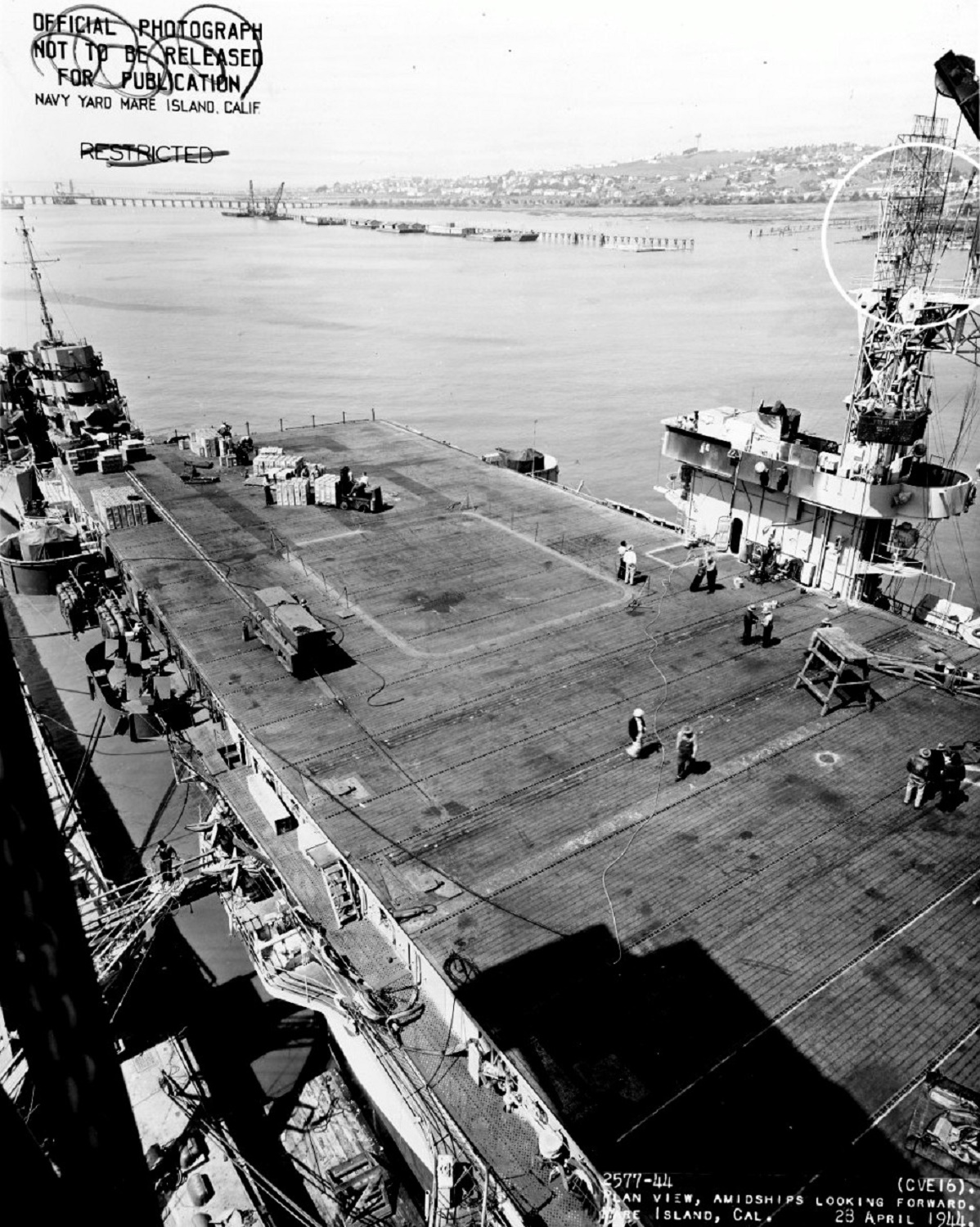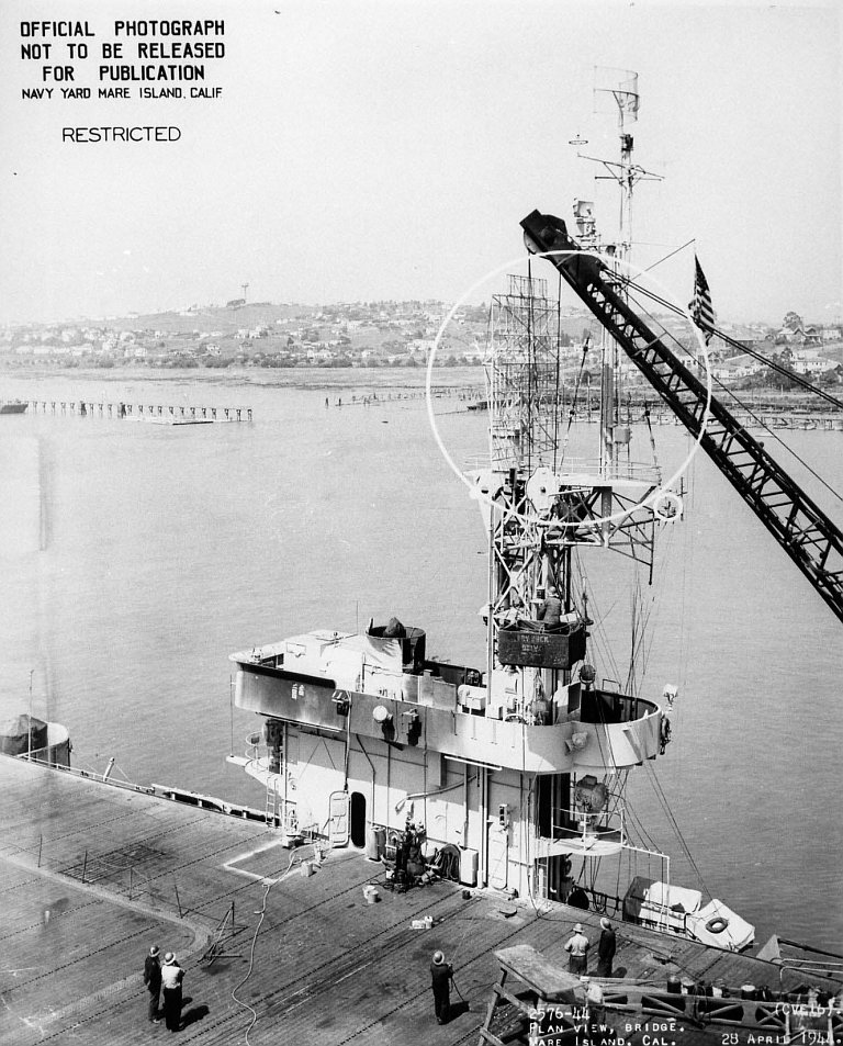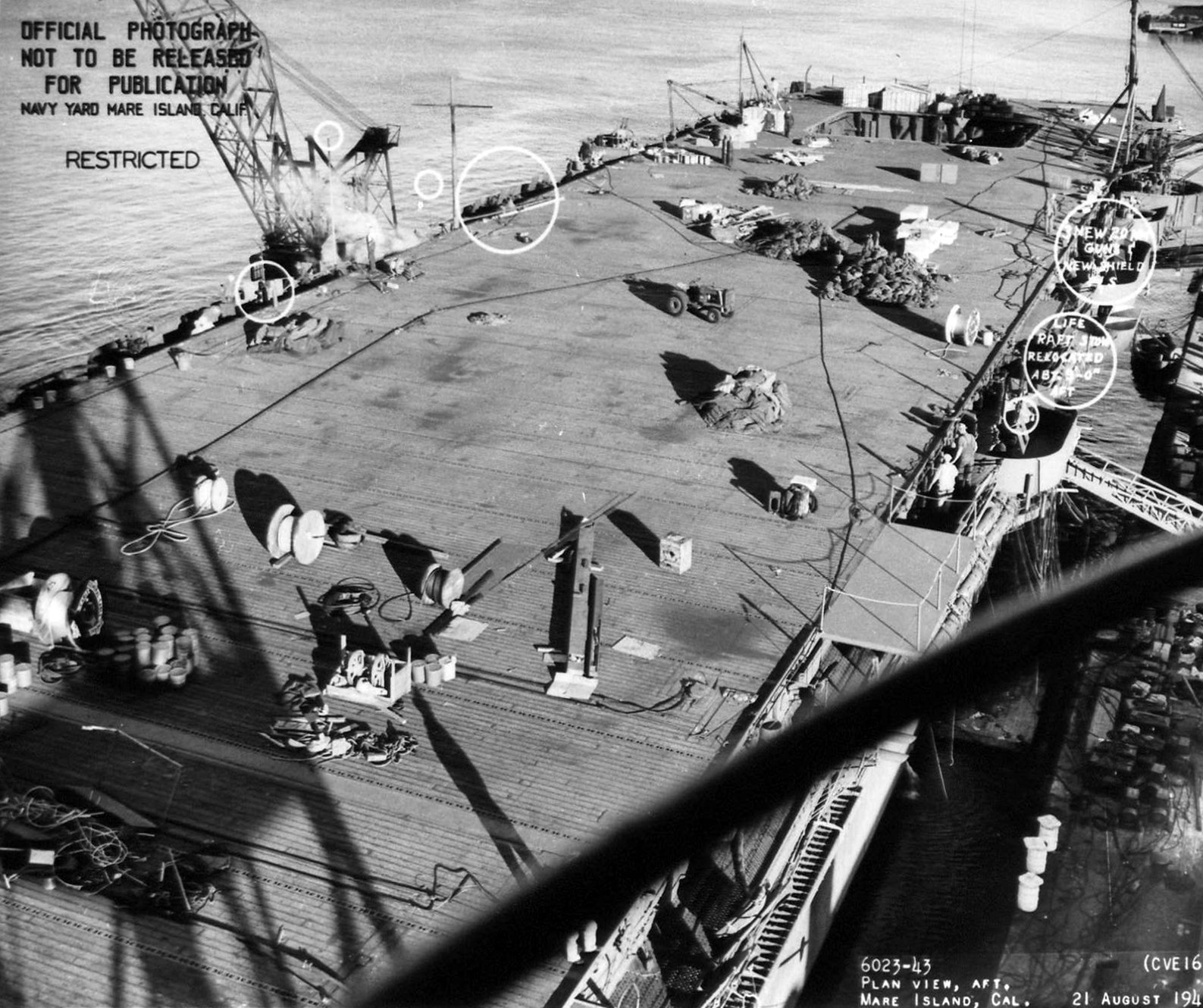 651k | USS Nassau (CVE-16), looking forward, Mare Island Navy Yard, 28 April 1944. Circles mark recent alterations. Note test load on catapult. National Archives and Records Administration (NARA), photo # 19-N-65111. |