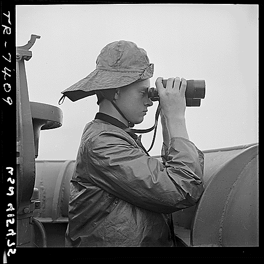 67k | SN2 Lawrence Britton on duty at port lookout aboard USS Nassau (CVE-16), October 1943. National Archives photo # 80-G-415475. |