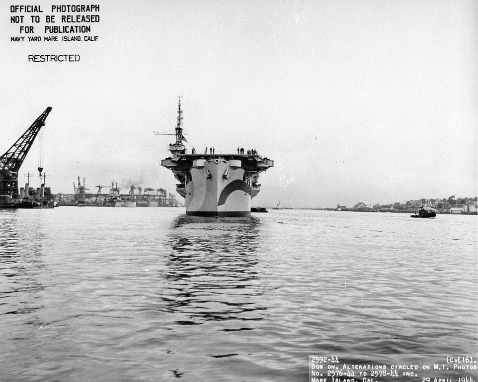 147k | Bow on view of USS Nassau (CVE-16) departing Mare Island on 29 April 1944. Official Mare Island photo # 2592-44. |