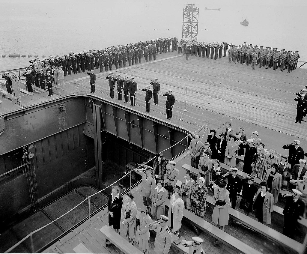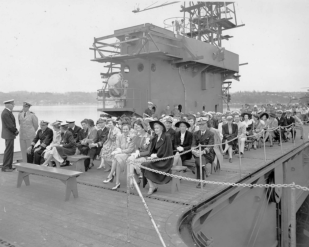 248k | Navy personnel and guests stand for the playing of the national anthem during the commissioning ceremonies of USS Nassau (ACV-16) at the Puget Sound Navy Yard on Thursday, 20 August 1942. US Navy and Marine Corps Museum/Naval Aviation Museum, photo # 2000.091.054.040. Austin K. Doyle Collection. |