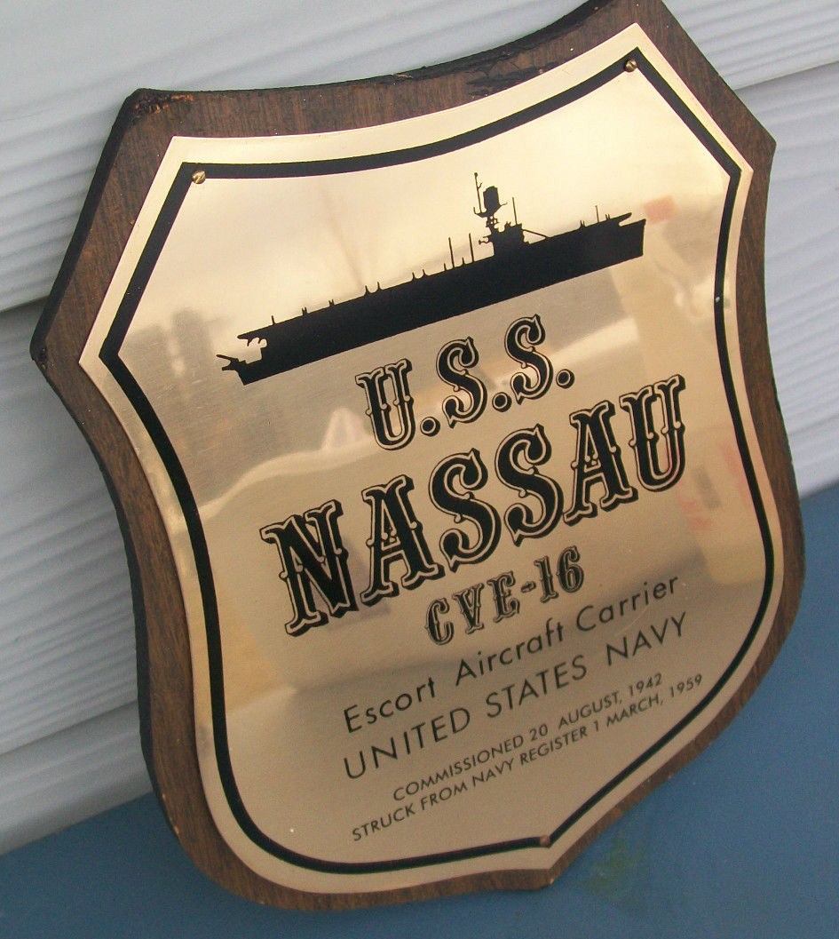 223k | "U.S.S. Nassau, CVE-16, Escort Aircraft Carrier, United States Navy, Commissioned 20 August, 1942, Struck from Navy Register 1 March, 1959" Wooden plaque. |