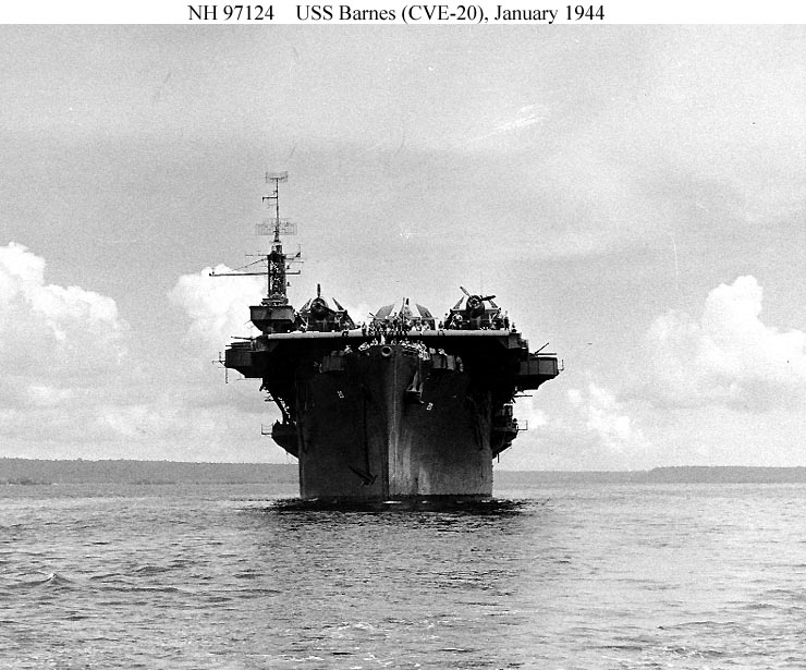 101k | USS Barnes (CVE-20) with Grumman TBF Avenger aircraft parked on her flight deck, 8 January 1944. Official U.S. Navy Photograph, from the collections of the Naval Historical Center (# NH 97124). |