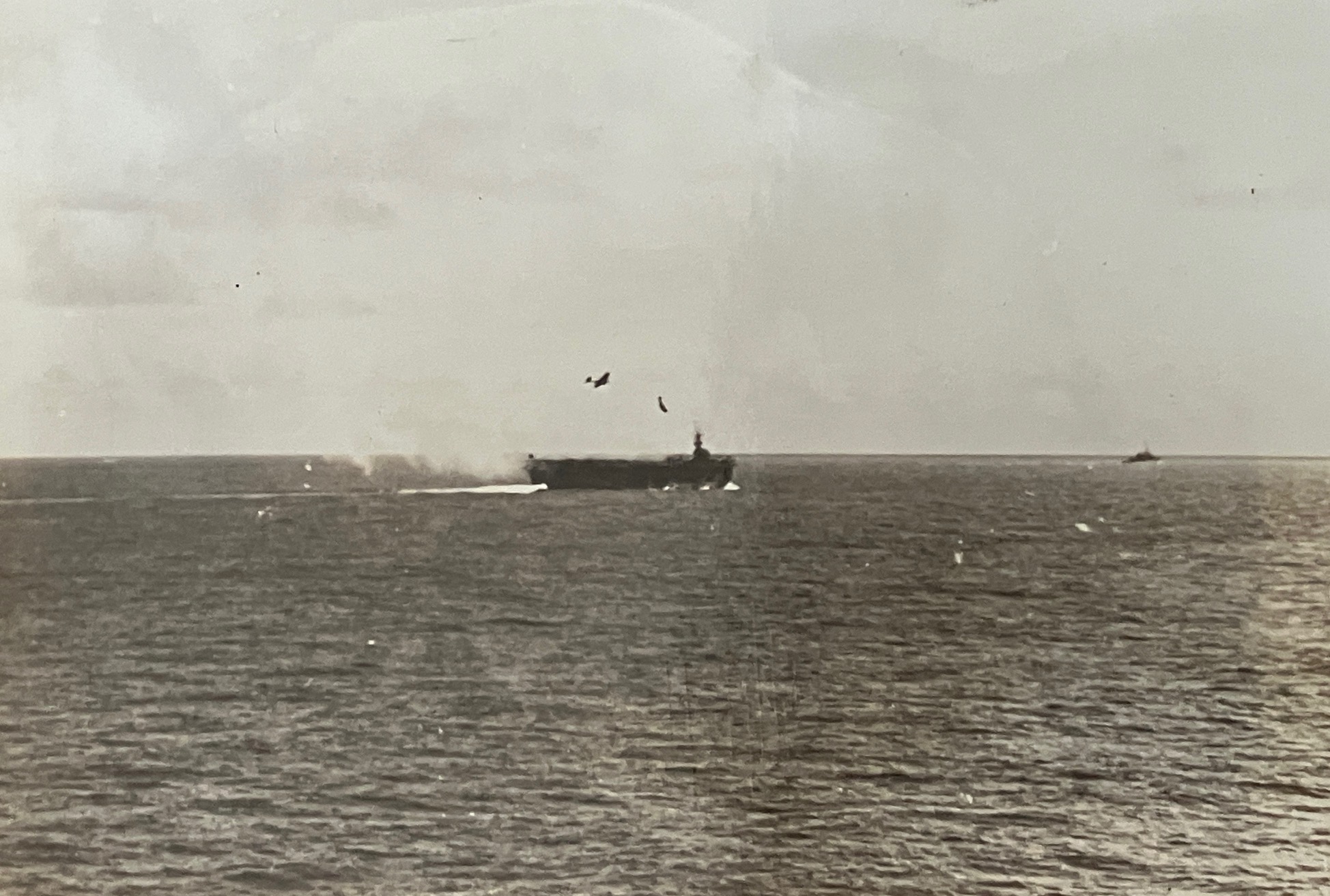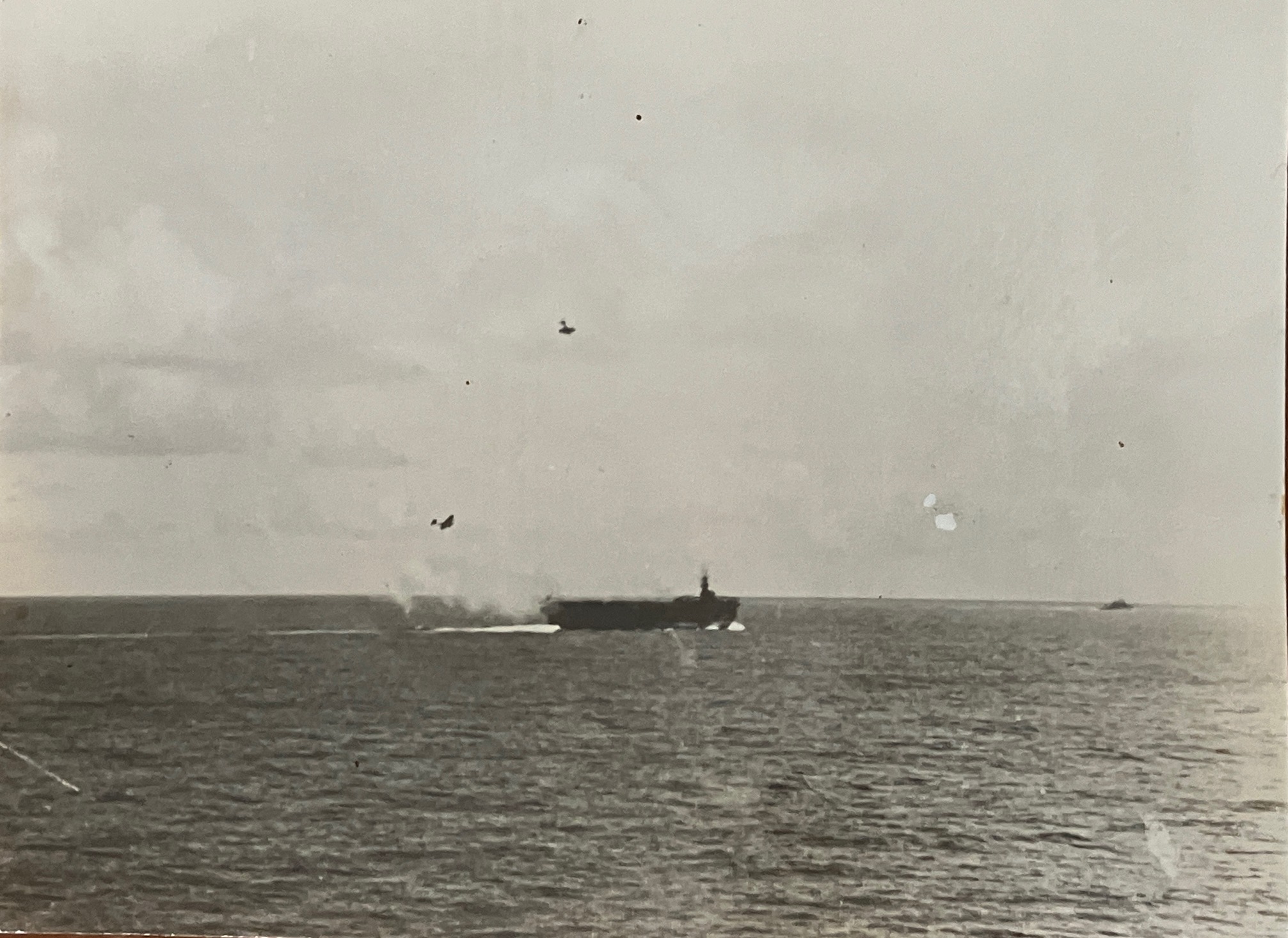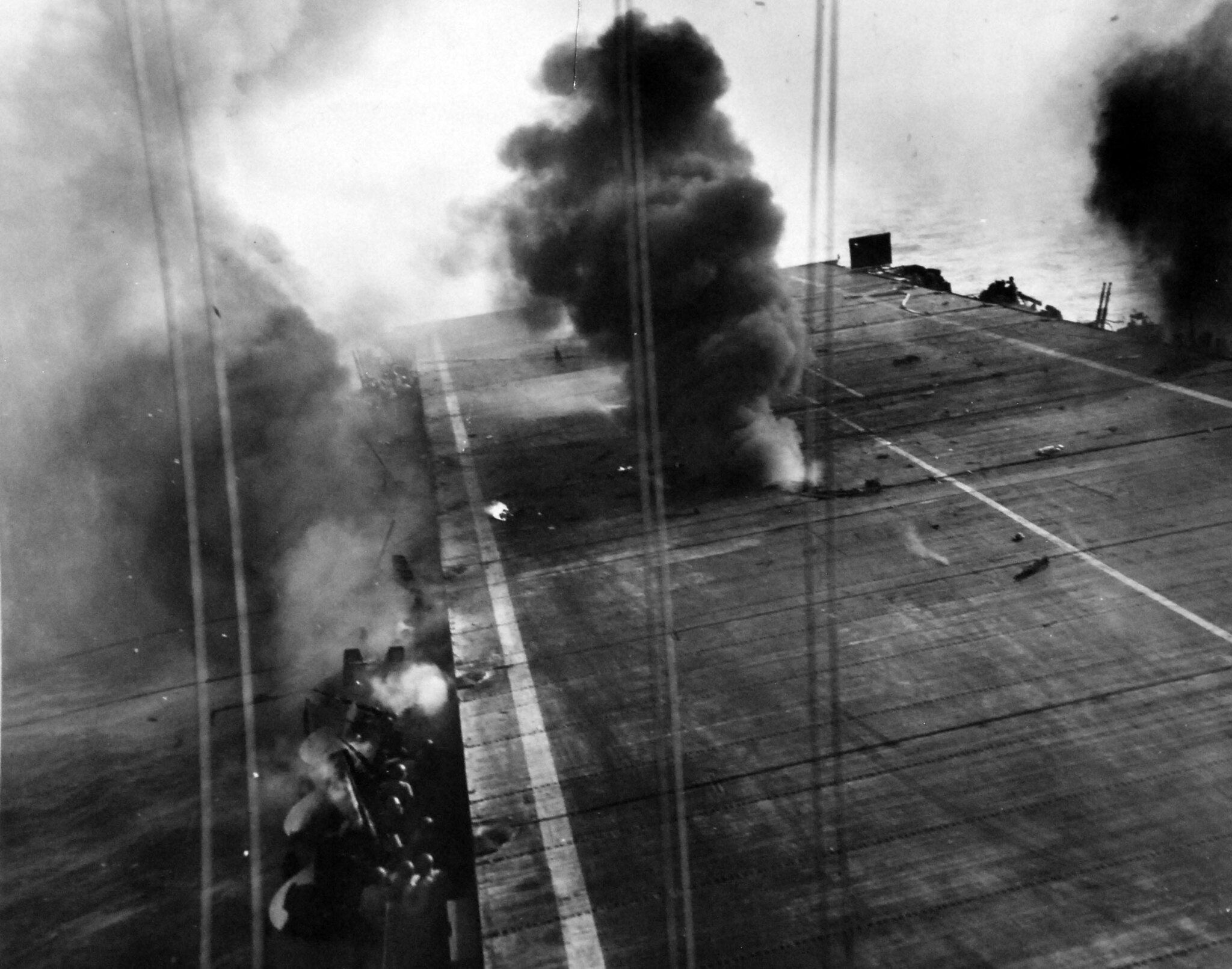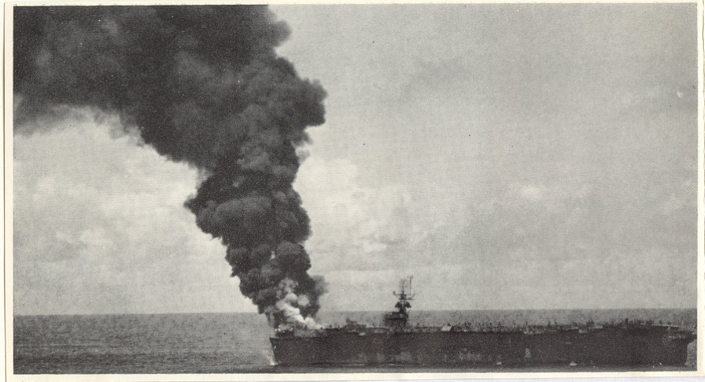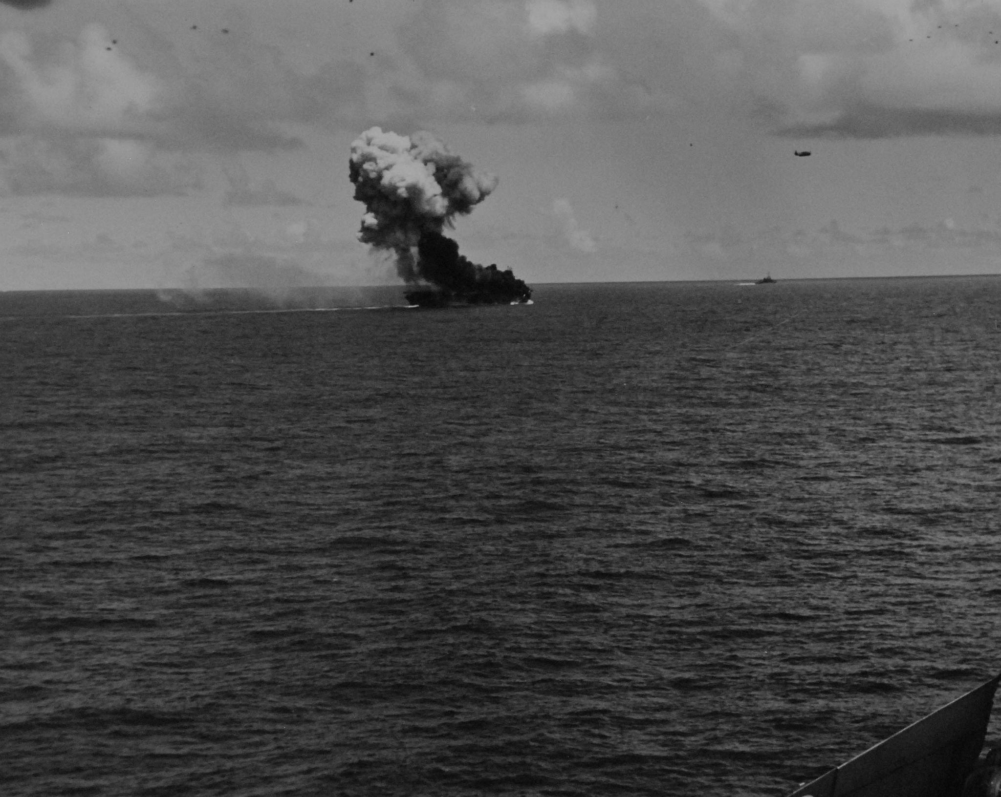 1.33M | Air Raids in the Pacific, 1 July 1945. Explosion in the background resulted from a carrier-plane strike on Balikpapan, Borneo. Photographed by USS Suwannee (CVE-27) aircraft. U.S. Navy photograph, now in the collections of the National Archives and Records Administration (NARA), # 80-G-349247. |