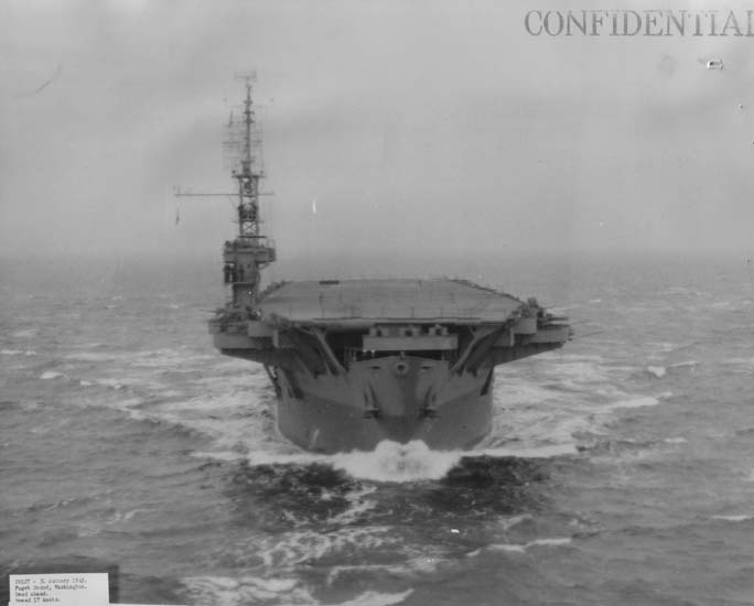 26k | Puget Sound, Washington, 31 January 1945. Dead ahead view of USS Suwannee