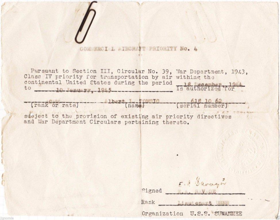 This propaganda leaflet was saved from a batch that was being air dropped by VT-60's Avengers on 22 October 1944. The leaflets were dropped on the Japanese installations located on the Visayas Islands, Philippines, in advance of the Battle of Leyte Gulf. Prepared by the Army Psychological Warfare Branch. Leaflet 3-J-1. The Japanese text reads in part: "Before you reach this miserable state, which is more than men ought to endure so far from home, we want you to keep something in mind. Those who choose to come to an honorable understanding with us will find that we treat them as human beings, not as enemies. We shall hold it as a duty to see that are given clothing, food, shelter, and medical care." This leaflet was aboard the carrier the moment she was hit by the Mitsubishi Zero (Mitsubishi A6M5 Navy Type 0 – Carrier Fighter Model 52), piloted by Tamisaku Katsumata, during the first Kamikaze attack in history (Battle off Samar, Battle of Leyte Gulf, 25 October 1944). It was kept as a souvenir by the USS Suwannee flight deck air traffic controller, Albert L. Tomsic, (Serial Number 618 10 62), to remember the horrible battle. |