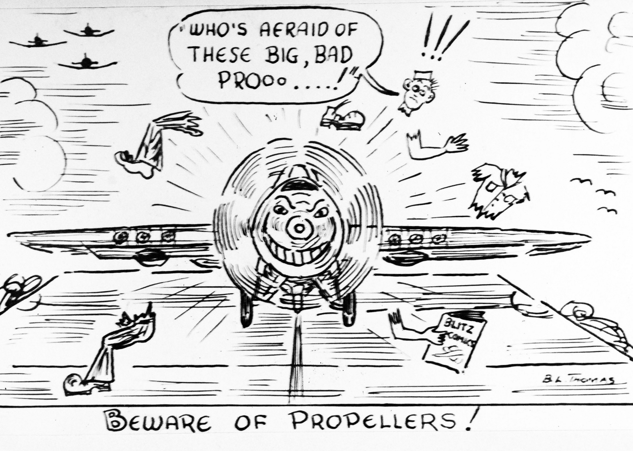 777k | Flight deck poster made by an AMM, B.L. Thomas, of the crew. Artwork details the dangers of propellers. Photograph: 7 April 1943. Official U.S. Navy photograph, now in the collections of the National Archives and Records Administration (NARA), photo # 80-G-39315. |