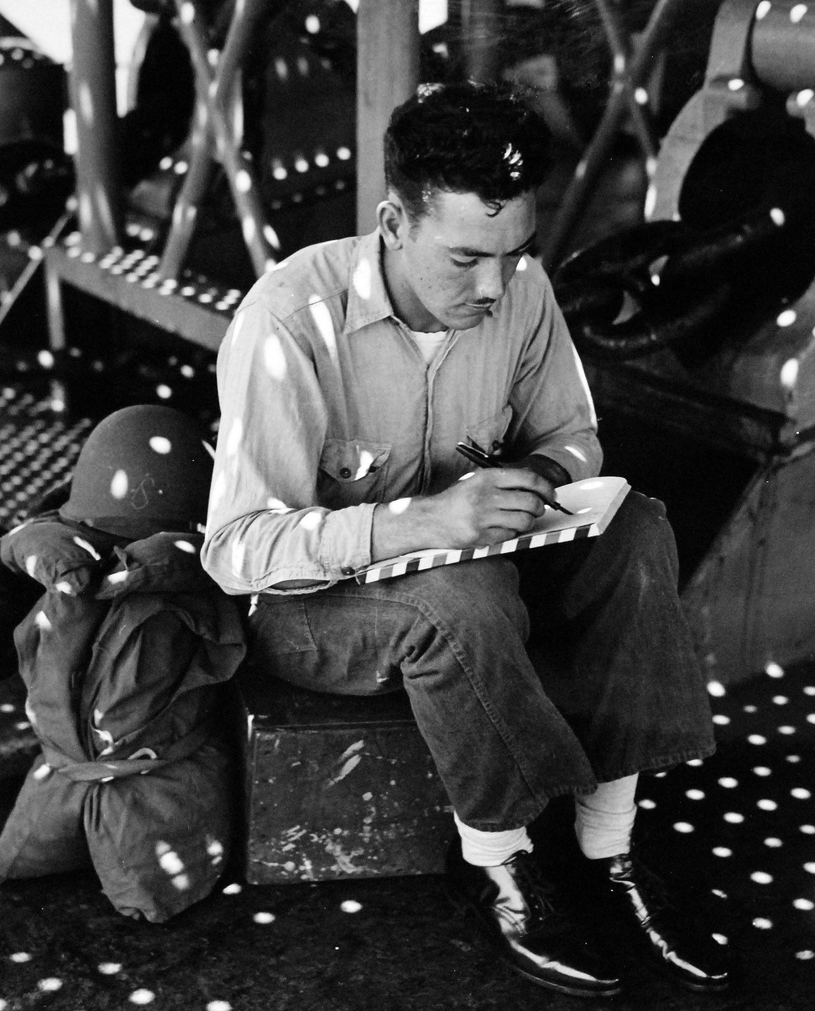 (CVE-27) for his letter writing. Photograph released 19 April 1945.