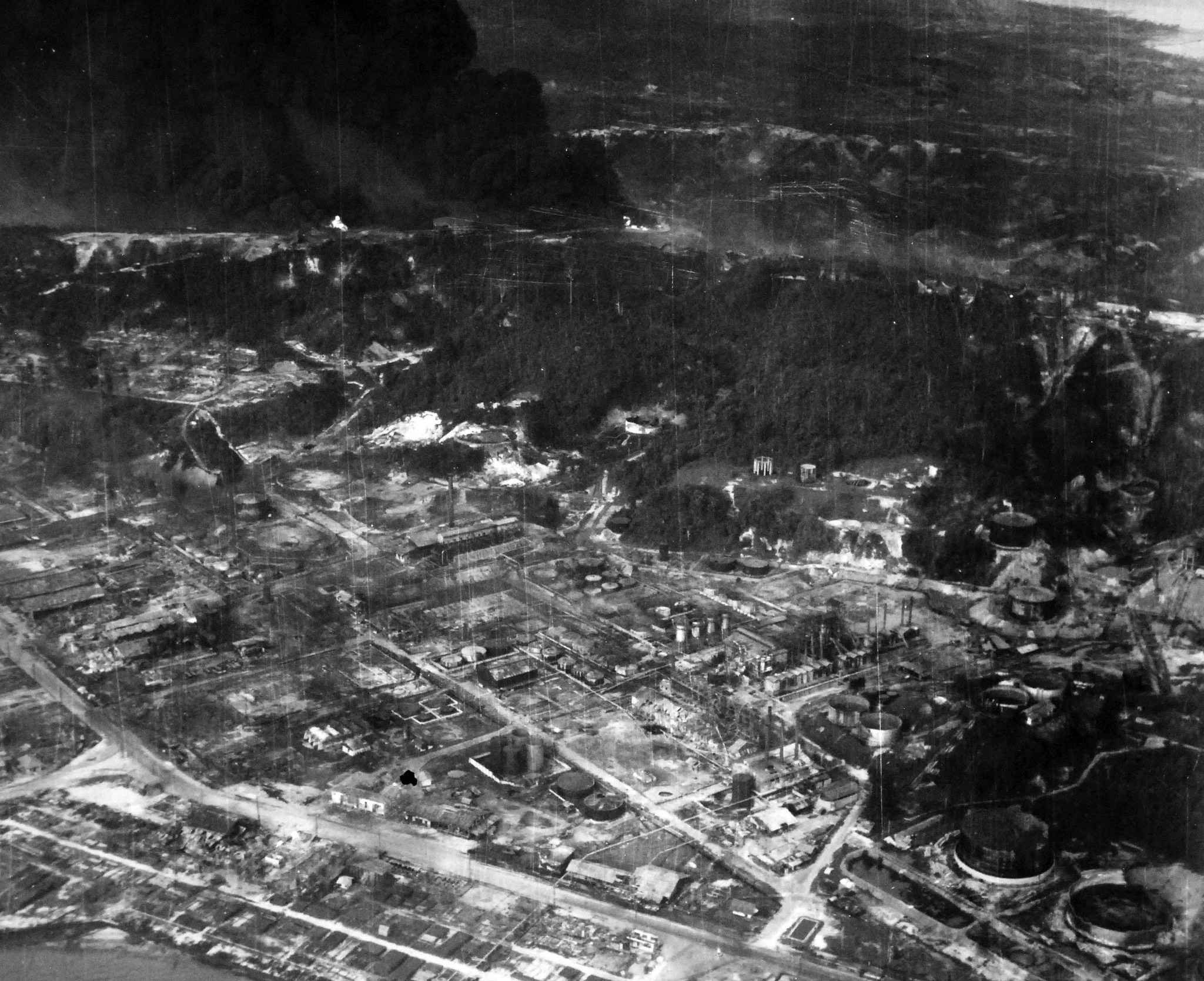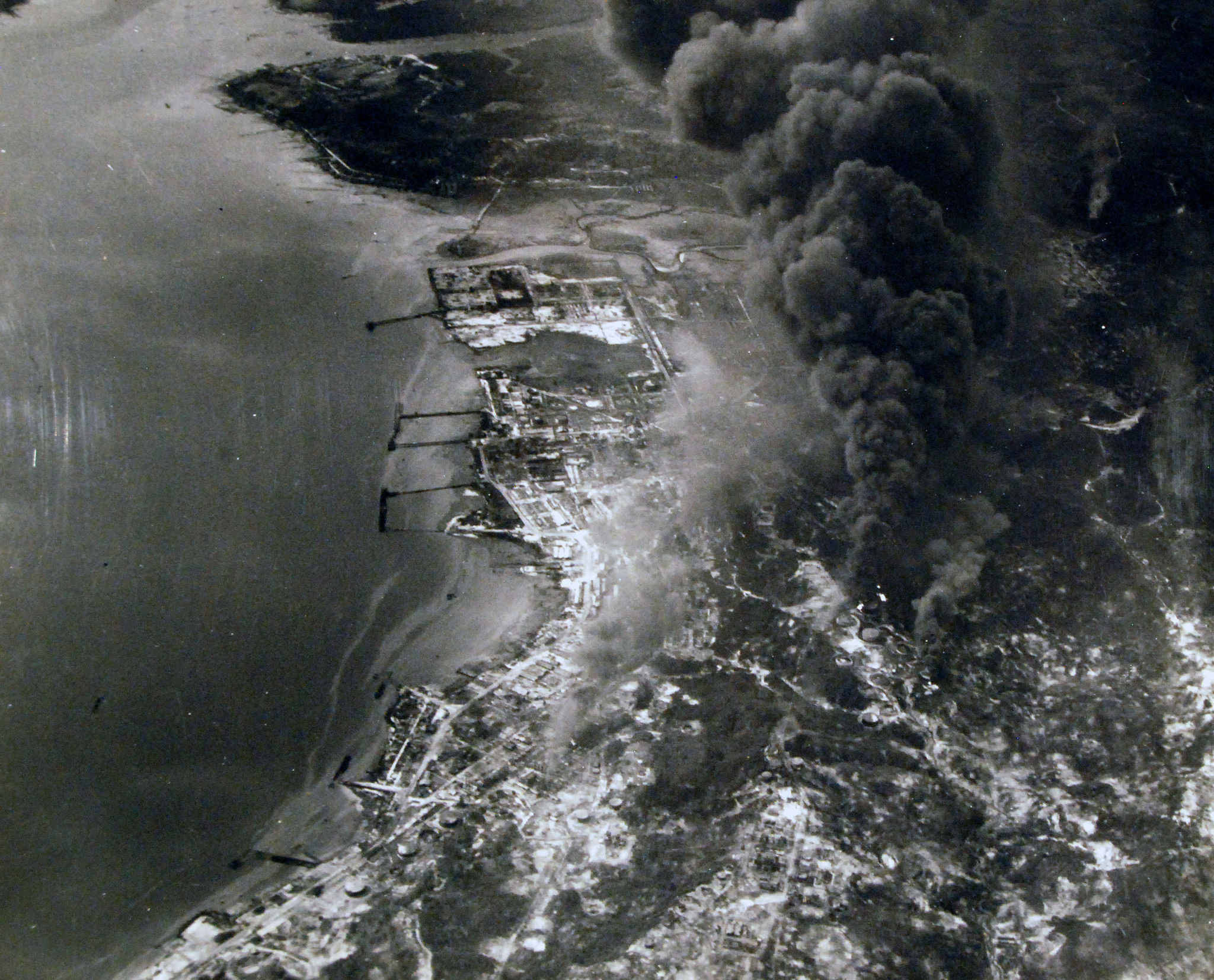 1.03M | Air Raids in the Pacific, 1 July 1945. Carrier plane strike causes huge oil tank fires at Balikpapan, Borneo. Photographed by USS Suwannee (CVE-27) aircraft. U.S. Navy photograph, now in the collections of the National Archives and Records Administration (NARA), # 80-G-349249. |