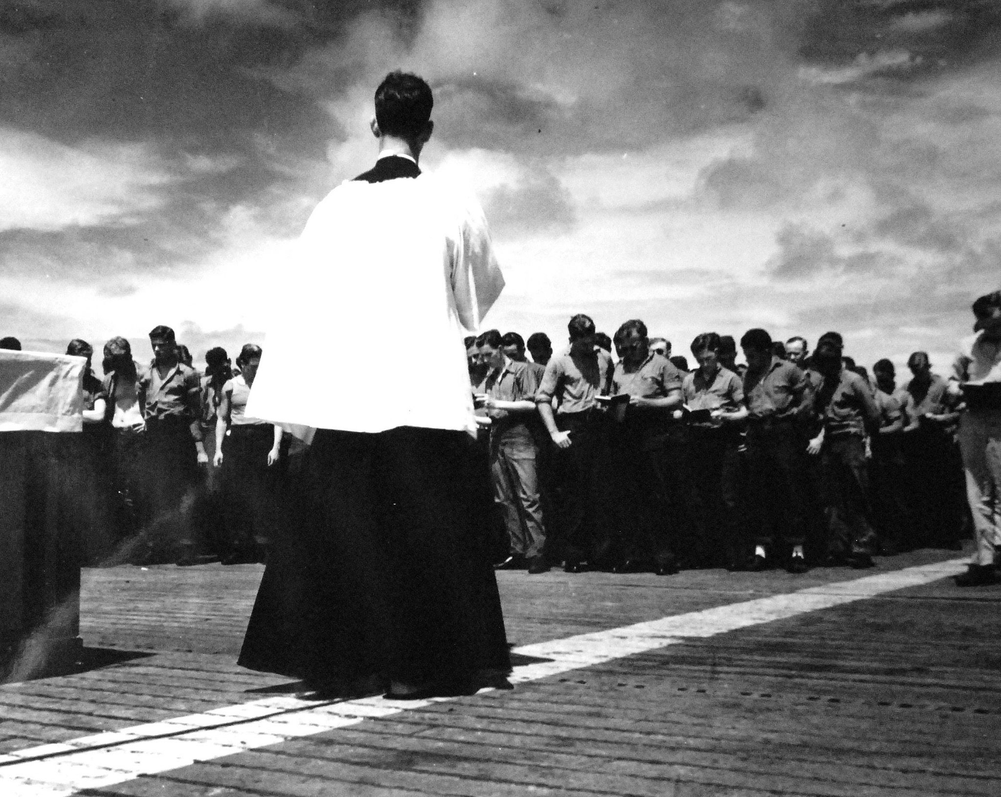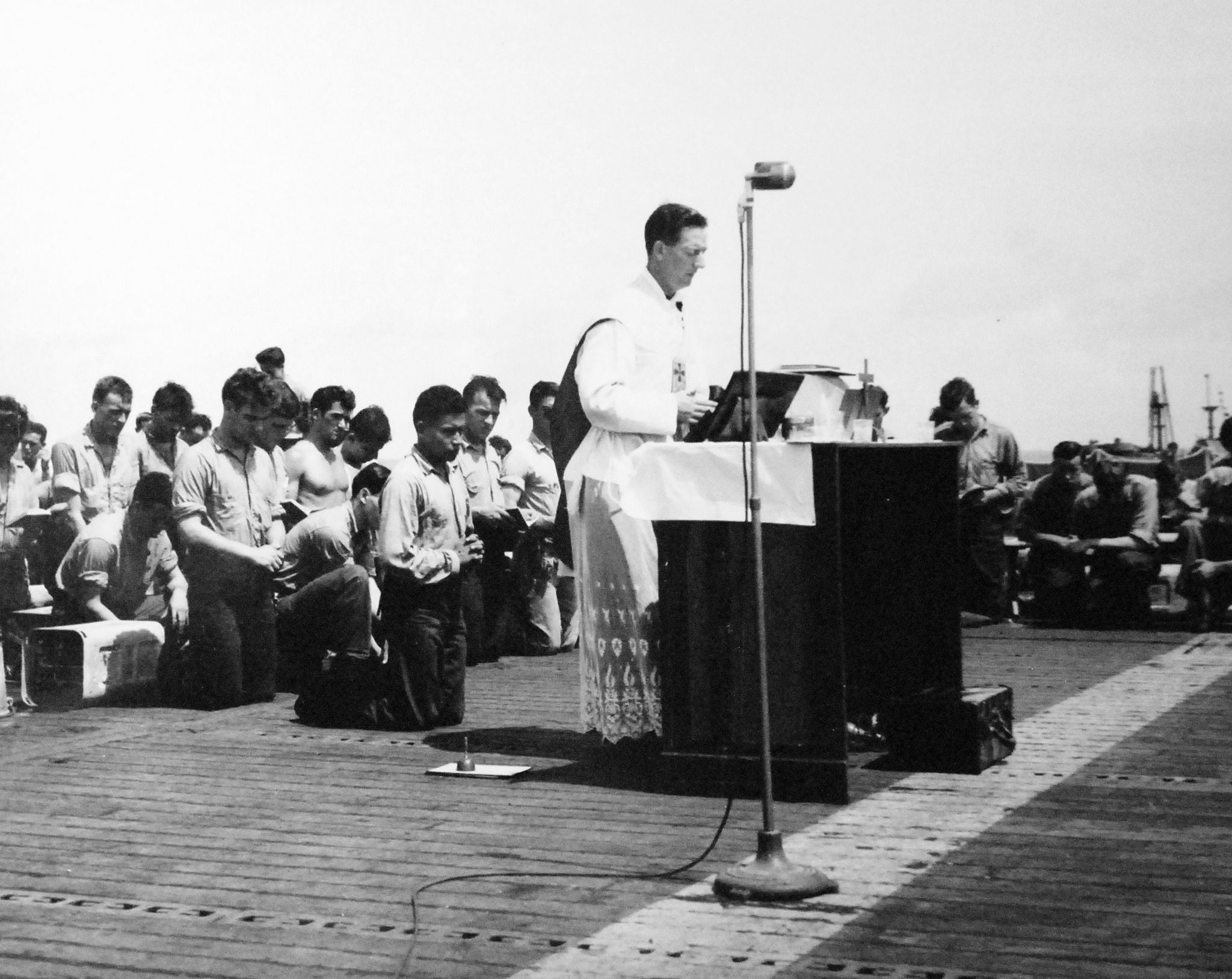 Chaplain is holding requiem service on the flight deck in honor of crewmembers lost in the battle.