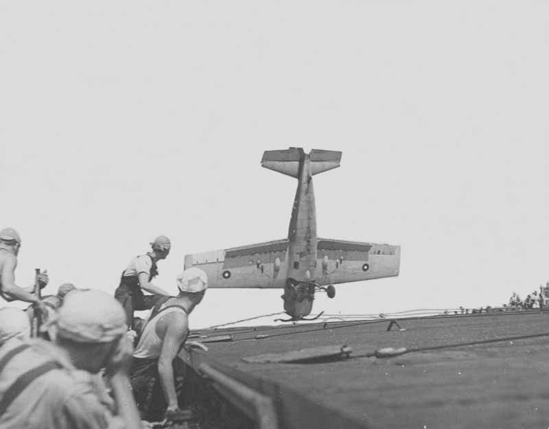 23k | Wildcat JV508 of 890 Squadron goes into the barrier, 15 May 1944, while HMS Atheling worked up as a fighter carrier with the East Indies Fleet. Photo from the collection of the late John Vallely, Sub Lt. (A) RNVR. (Thans to Oliver Prout, grandson of a pilot in 890 Squadron, who provided additional information.) (Digitally cleaned by Tom Kermen.) |