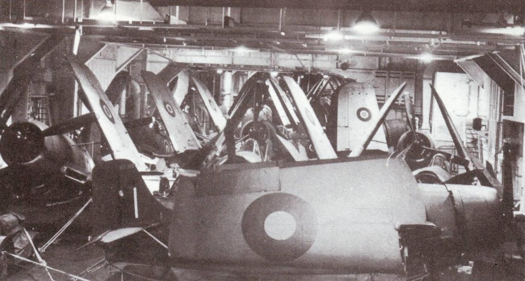 179k | Undated pic showing Corsair and Hellcat fighters stowed away in the cramped hangar deck of the escort carrier HMS Atheling. The photo was taken during anti-shipping operations off the Norwegian Coast, prior to the formation of the British Pacific Fleet. Fleet Air Arm Museum. Photo and text from The British Aircraft Carrier, by Paul Beaver. |