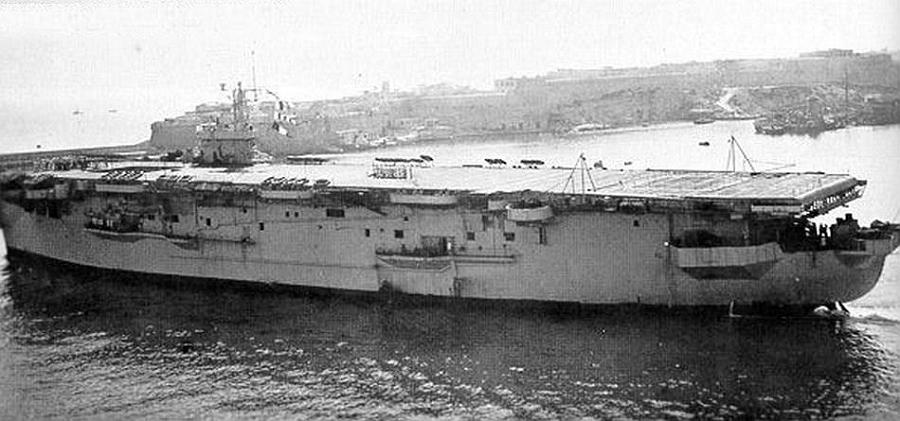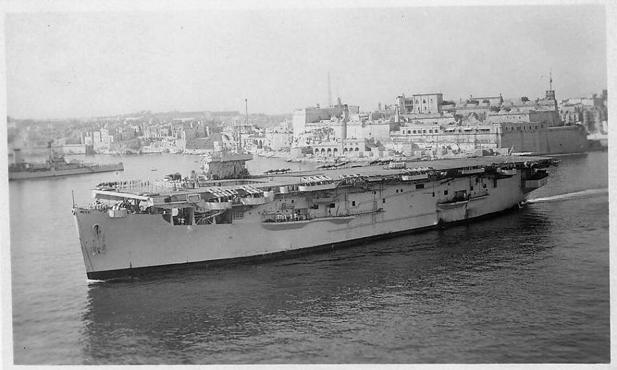 72k | HMS Atheling (D51), ex-Glacier (CVE-33), departing Malta (early 1944?). |