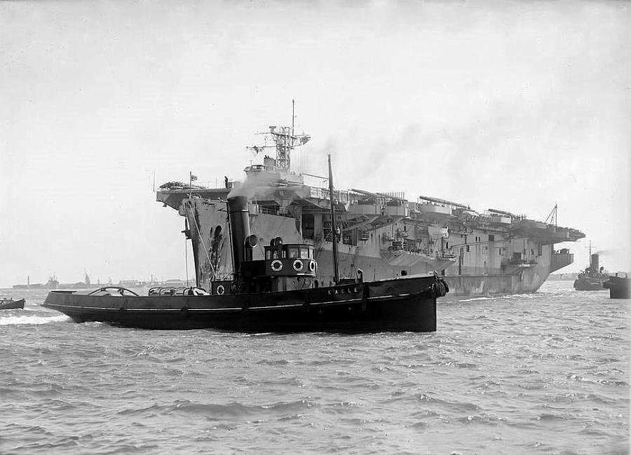 75k | HMS Atheling (D51), ex-USS Glacier (CVE-33), with tugboat Eagle, date and location unknown. |
