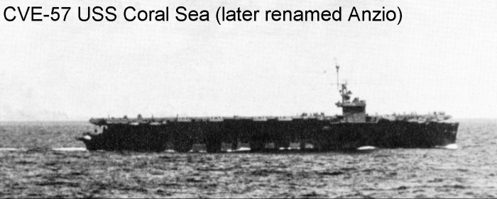 121k | "USS Coral Sea (CVE-57), now Anzio (CVE-57)." Photographed from USS Natoma Bay (CVE-62) by R.N. Johnson, PhoM1/c. Photo # CVE 62-182, dated 13 January 1944. National Archives photo (# 80-G-275945). |