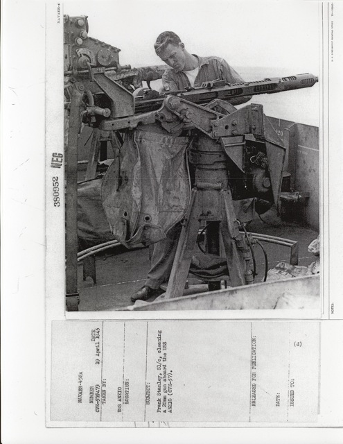 98k | "Frank Stanley, S1/c, cleaning a 20mm gun aboard the USS Anzio (CVE-57)." Photo # CVE-57#473, dated 19 April 1945. National Archives photo (# 80-G-380952). |