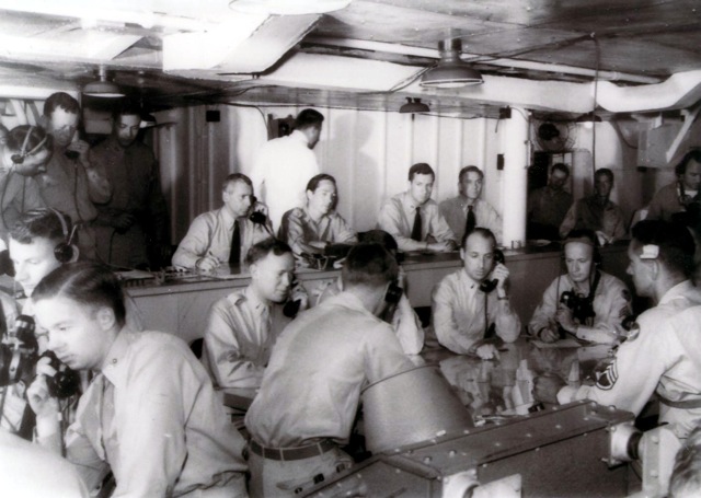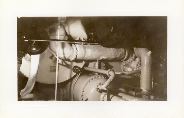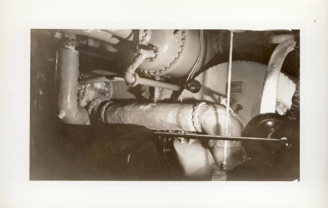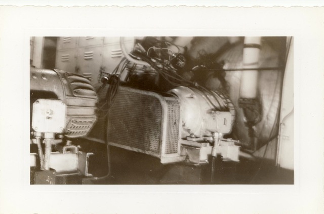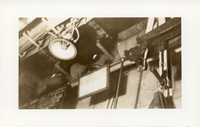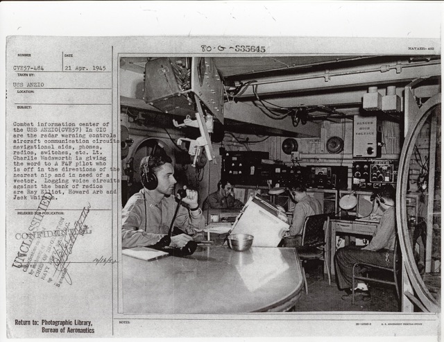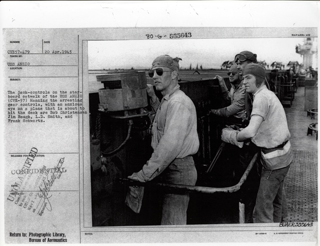 115k | "The jack-controls on the starboard catwalk of the USS Anzio (CVE-57). Manning the arresting gear controls, with an anxious eye on a plane that is about to hit the deck are Bob Christensen, Jim Bough, L.D. Smith, and Frank Schwartz." Photo # CVE57-479, dated 20 April 1945. National Archives photo (# 80-G-335643). |