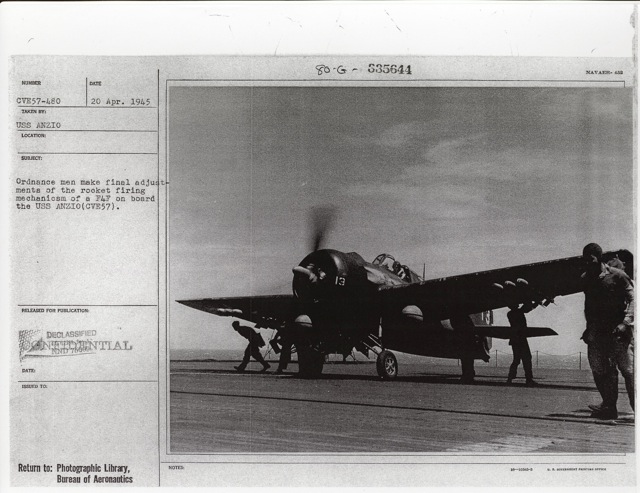 101k | "Ordnance men make final adjustments of the rocket firing mechanism of a F4F on board the USS Anzio (CVE-57)." Photo # CVE57-480, dated 20 April 1945. National Archives photo (# 80-G-335644). |
