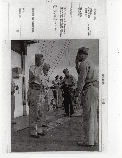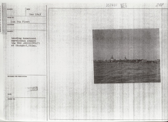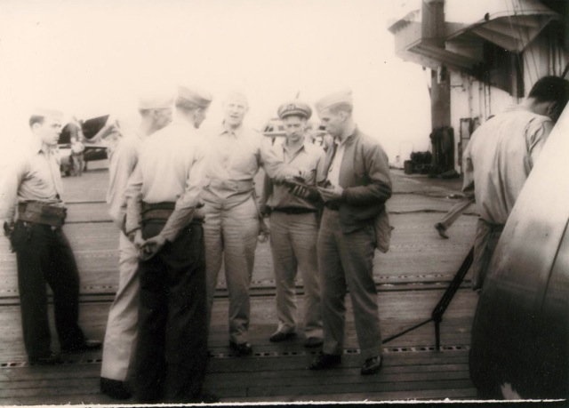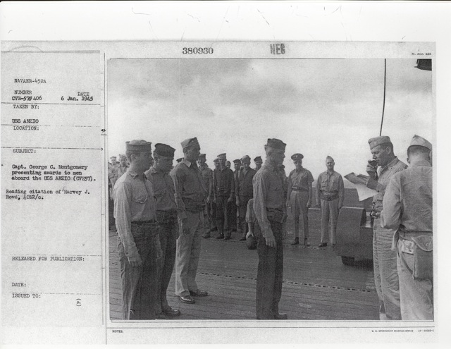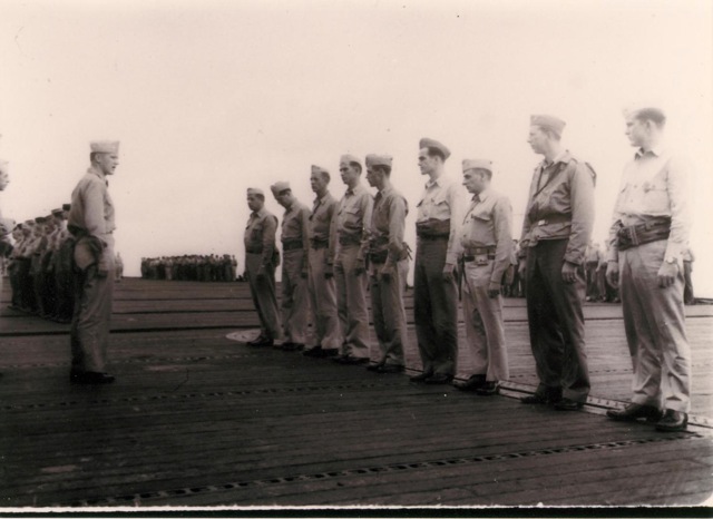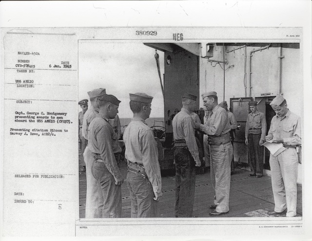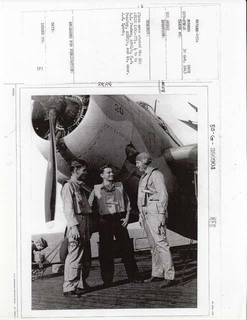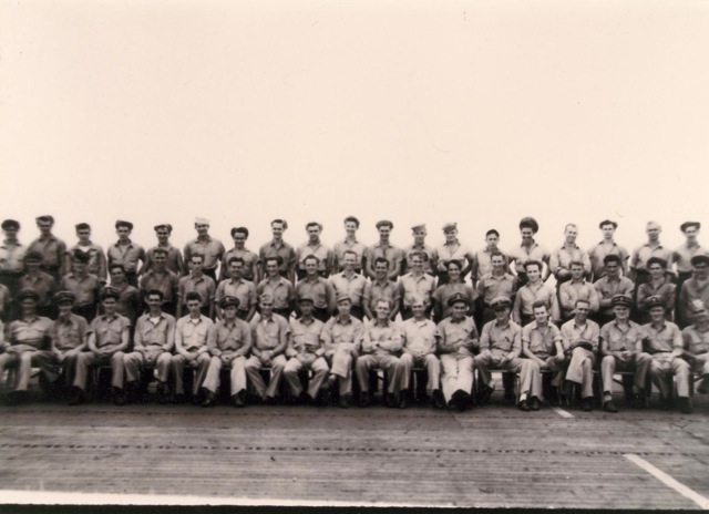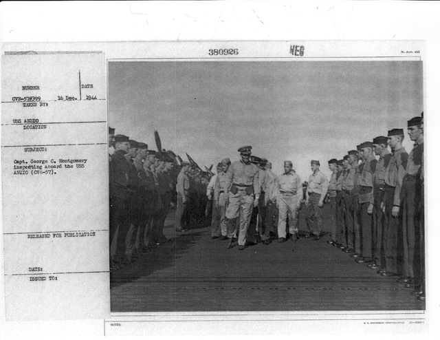 104k | "Capt. George C. Montgomery USN shaking hands with the Key men who keep the flight and hangar deck of the USS Anzio (CVE57) clicking smoothly (l-r) Lt. Robert L. Thornton, Ens. Richard T. Hansen, Charles J. Mohler, AMM/1c, Maurice P. Murphy, Cox, John Stefanou, ACMM, Elija R. Murry, Mach., Frank Sinore, AMM2/c, Tolson W. Linch, AMM3/c, and Charlie P. Jennings, BM/2c." Photo # CVE57-526, dated 23 May 1945. National Archives photo (# 80-G-335650). |