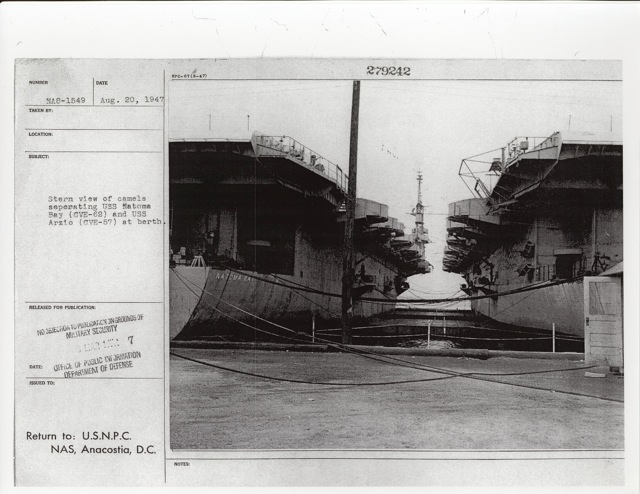 99k | "Stern view of camels separating USS Natoma Bay (CVE-62) and USS Anzio (CVE-57) at berth." Norfolk, VA. Photo # NA8-1549, dated 20 August 1947. National Archives photo (# 80-G-279242). |