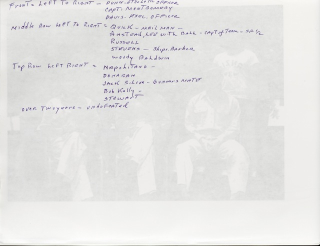119k | Basketball team, USS Anzio. Over two years, undefeated. Front row (l to r): Dunn, athletic officer; CAPT Montgomery, CO; Davis, XO. Middle row (l to r): Quick; Amstead, Capt. of team; Russell; Stevens; Baldwin. Back row (l to r): Napolitano; Dunigan; Silcox; Kelly; Stewart. Remark: Note that the name of the man second from left, back row, is misspelled as "Donagan" in the original, handwritten annotation. However, William J. Dunigan IV has identified his father, William James Dunigan, and has informed us of the correct spelling (thank you, William). |