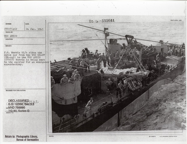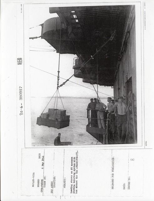 85k | "Loading stores on #5 sponson showing hoisting system with box aboard the USS Anzio (CVE-57)." Photo # CVE-57#286, dated 6 May 1944 (note that CVE-57's name was Coral Sea on this date). National Archives photo (# 80-G-380917). |