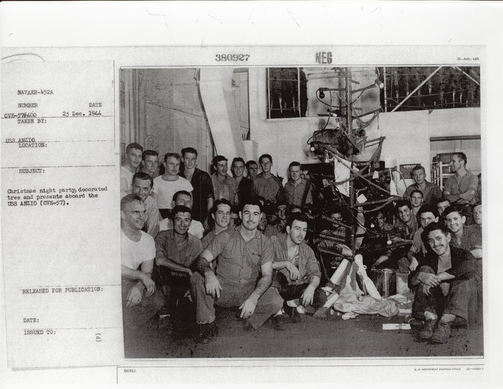 116k | "Sailors aboard the USS Anzio (CVE-57) receiving an inspection by Ens. Richard Hansen, USNR, aircraft maintenance officer on this ship and his Div. Chief, Kenneth W. Firestone, ACM, USN." Photo # CVE57-505, dated 28 April 1945. National Archives photo (# 80-G-335647). |