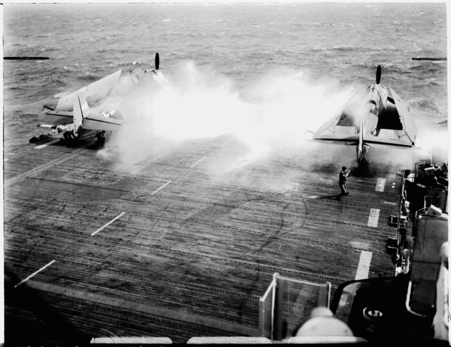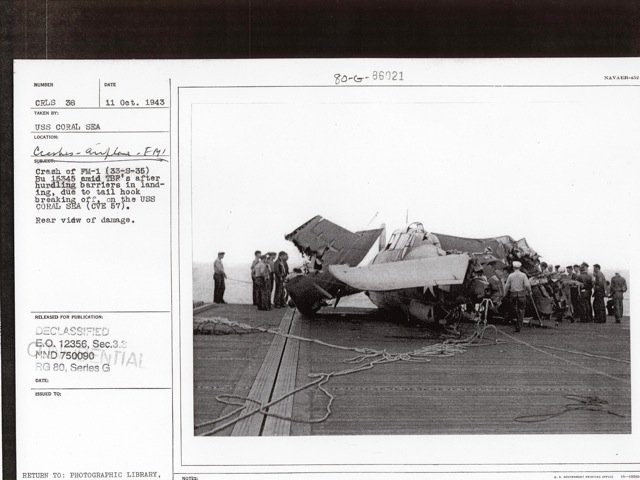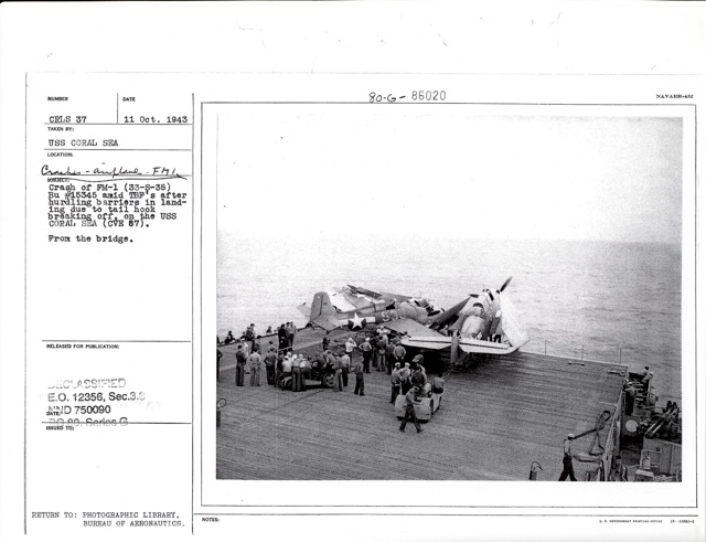 in landing, due to tail hook breaking off, on the USS Coral Sea (CVE-57). National Archives photo (# 80-G-86021). |