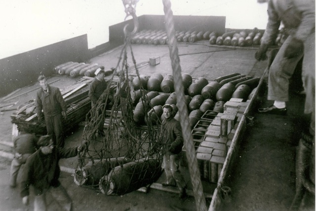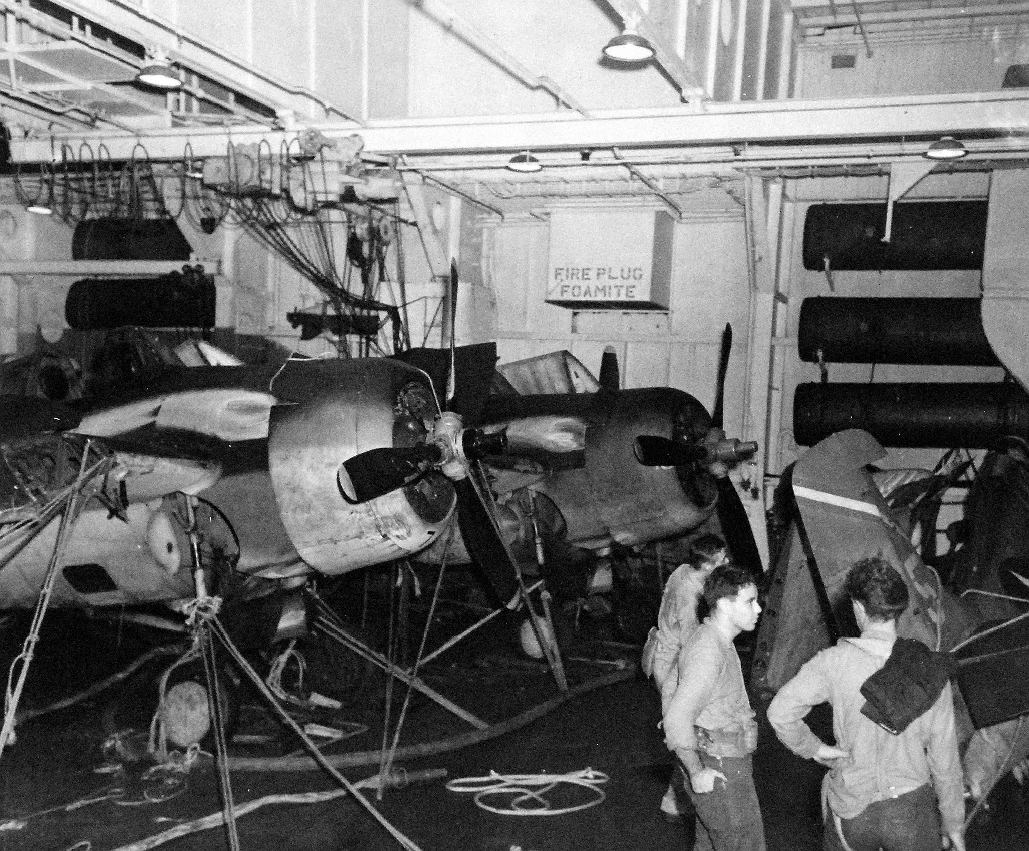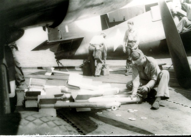 125k | "Fusing bombs on the hangar deck of the USS Anzio (CVE-57) are Warren McKenzie AOM2/c, T.W. Simmons, AOM3/c, Gene Gagnor, S1/c, W.A. Robertson, AOM1/c Dan Ogles, SP(X)1/c, Waldo Harpine AOM1/c Allen Steele SP(X)3/c and Floyd Ehlers, SP(X)1/c." Photo # CVE57-478, dated 20 April 1945. National Archives photo (# 80-G-335642). |