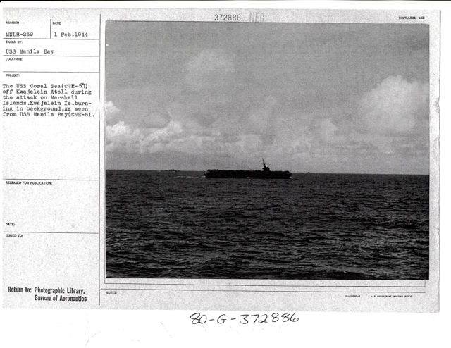 112k | "The USS Coral Sea (CVE-57) off Kwajalein Atoll during the attack on Marshall Islands. Kwajalein Is. burning in background. As seen from USS Manila Bay (CVE-61)." Photo # MNLB-239, dated 1 February 1944. National Archives photo (# 80-G-372886). |