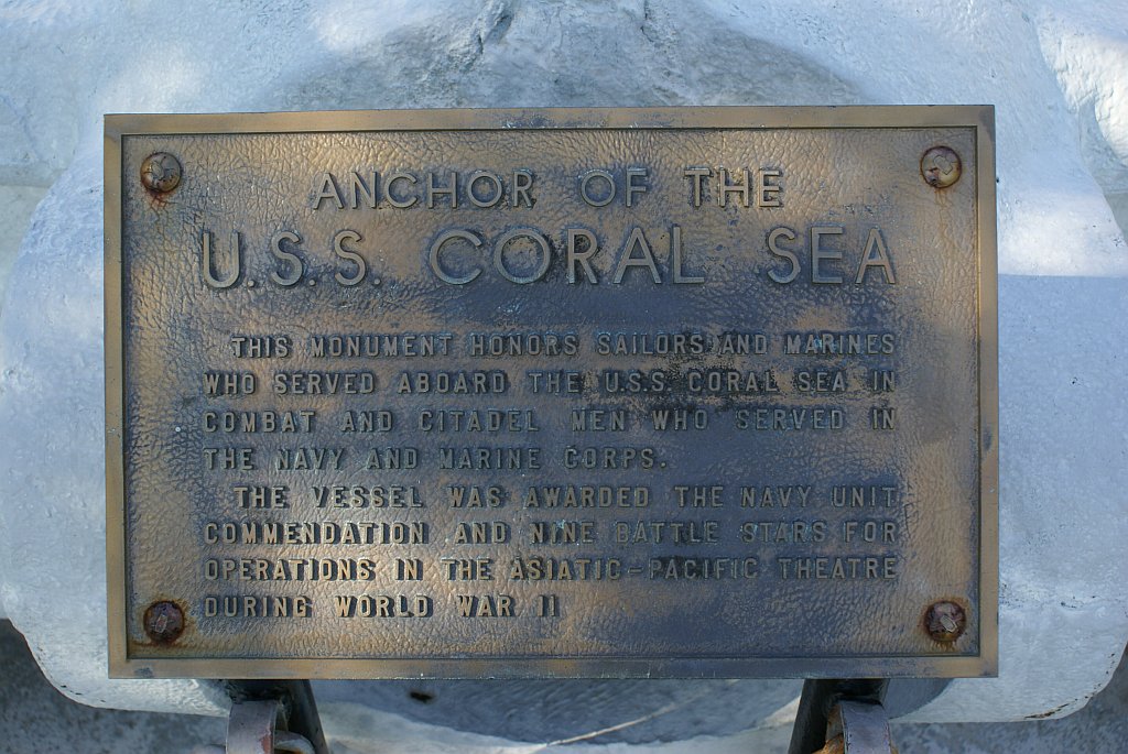 178k | An anchor from Coral Sea/Anzio on loan from the Naval History & Heritage Command to the "Citadel" Military Academy/University, South Carolina. It sits on the outside of the parade grounds along with several other military artifacts. March 2008. (Corrected info thanks to Dave Nilsen.) |