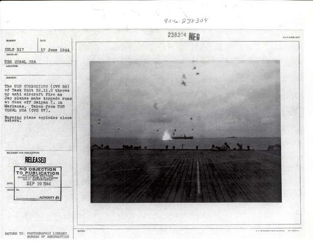 97k | "The USS Corregidor (CVE-58) of Task Unit 52.11.2 throws up anti aircraft fire as Jap planes make torpedo runs at dusk off Saipan I. in Marianas. Taken from USS Coral Sea (CVE-57)." "Burning plane explodes close astern." Photo # CRLS 317, dated 17 June 1944. National Archives photo (# 80-G-238304). |